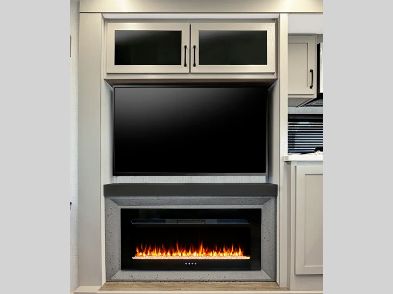 This spacious fifth wheel with four slide outs is sure to meet all your needs! Your crew can relax in the rear living area on the sofa/sleeper or the theater seat across from the fireplace and 50" TV. There is also a free-standing table with chairs with an extension where you can dine at, plus a kitchen island for more counter space in the kitchen. There is a spacious full bath with dual bath sinks so you both can get ready at the same time, and the front private bedroom will provide you with your own space in the evenings. Here, you'll find a king bed and wardrobe slide, a second wardrobe, and washer/dryer prep with a removable shelf for more storage space. Head outdoors to enjoy the two power awnings, and you can grab your hiking gear from the rear slide tray!