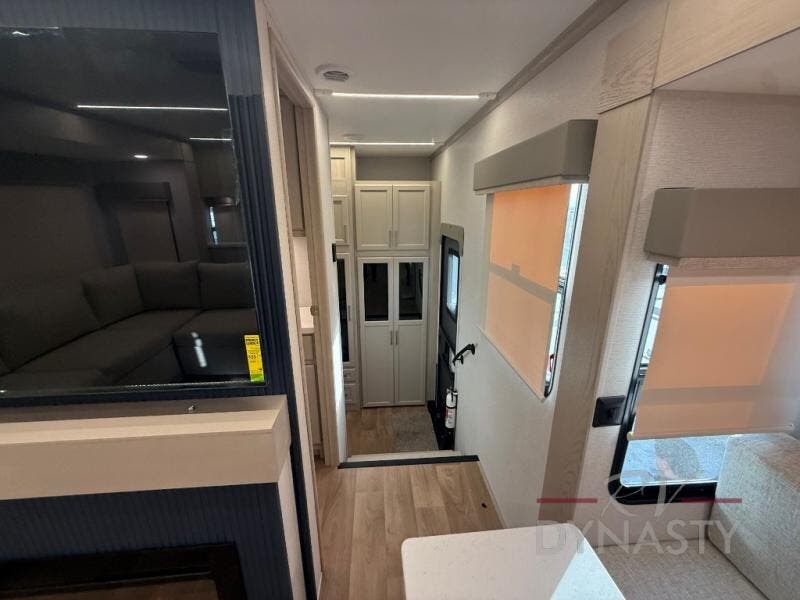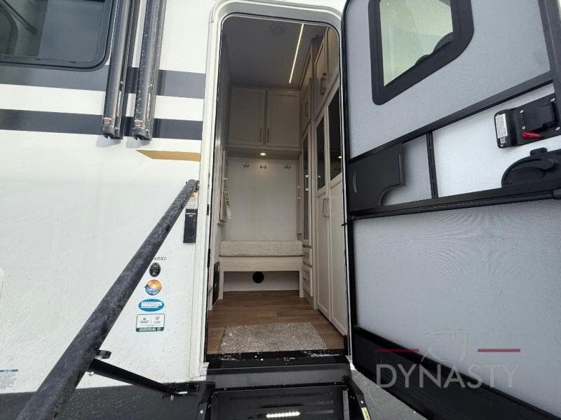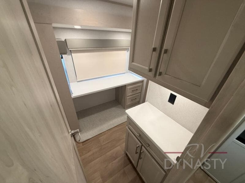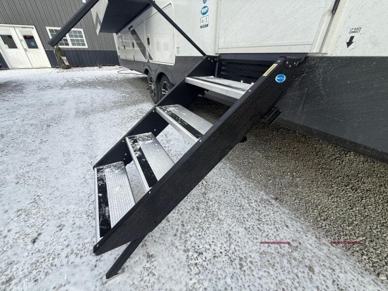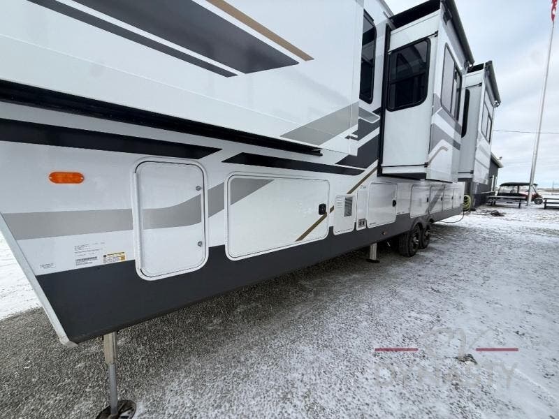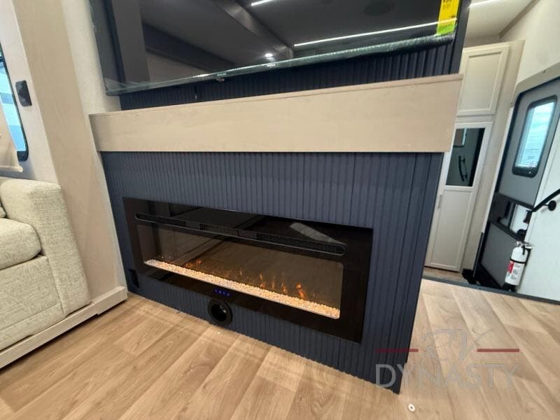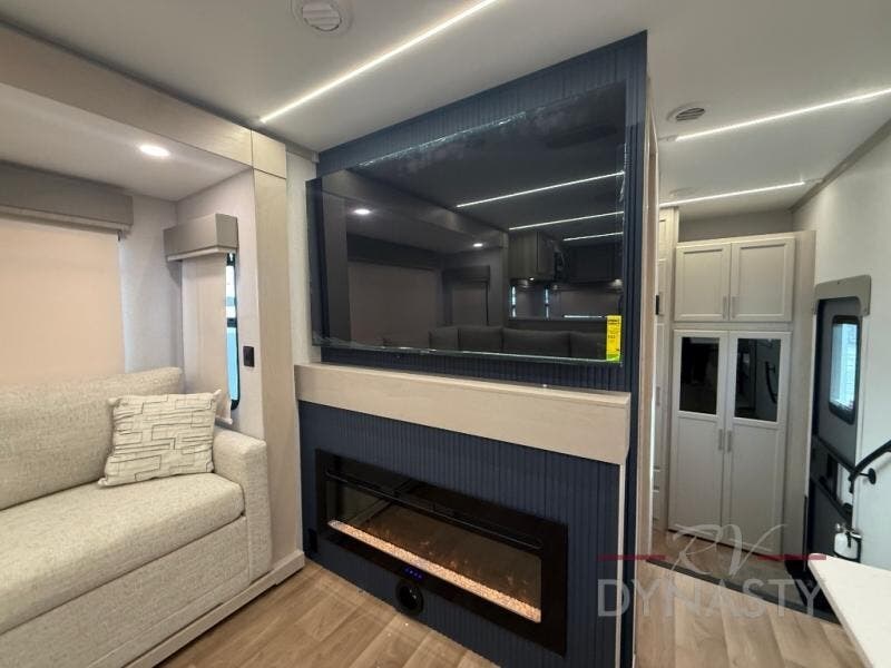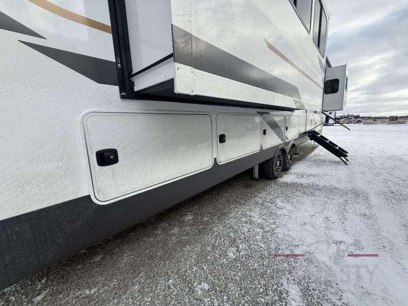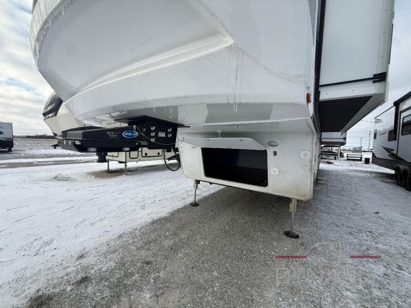 You will love every minute spent in this unique fifth wheel! As you enter the unit, you'll find a mud room with a bench seat, storage, plus washer and dryer prep. The front master bedroom will be your own oasis each day since there is an office space with a desk slide out and a hallway that leads to the front bedroom. Here, you'll find a king bed slide, a front bench, plus a slide out with a TV, fireplace and wardrobe; how convenient! When you've worked up an appetite, the rear kitchen includes everything you need to make home-cooked meals, along with a bar top that overlooks the living room, a spacious pantry, and a table with chairs to dine at. You can spend your evenings relaxing on the L-lounge by the entertainment center with a fireplace, or you can head outdoors to sit under the 19' power awning with LED lights!