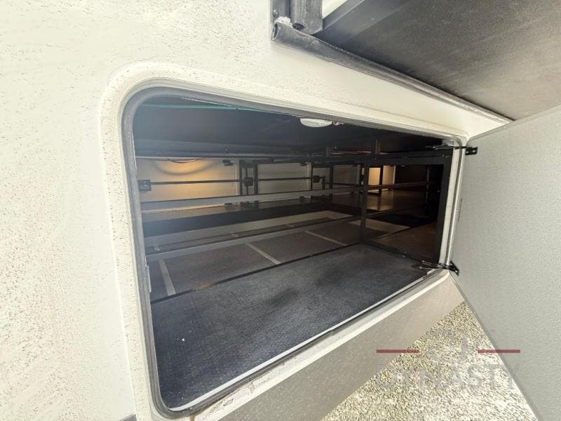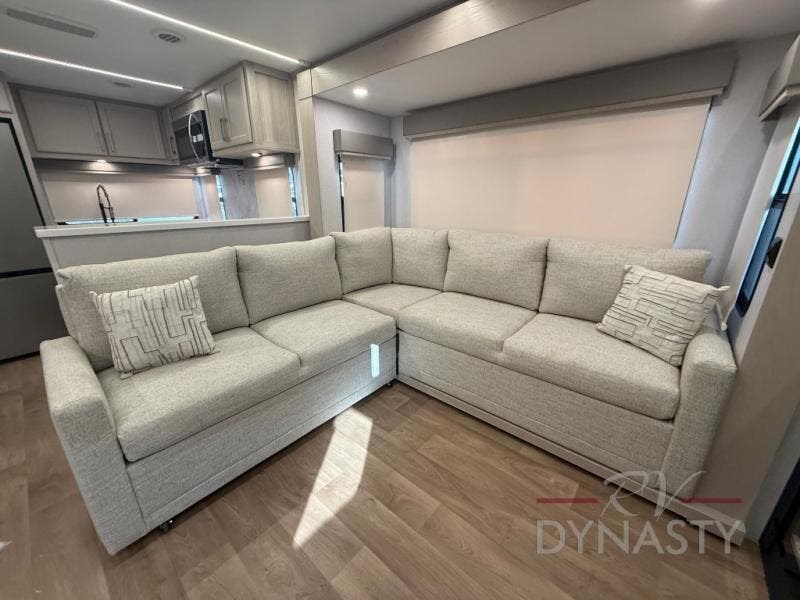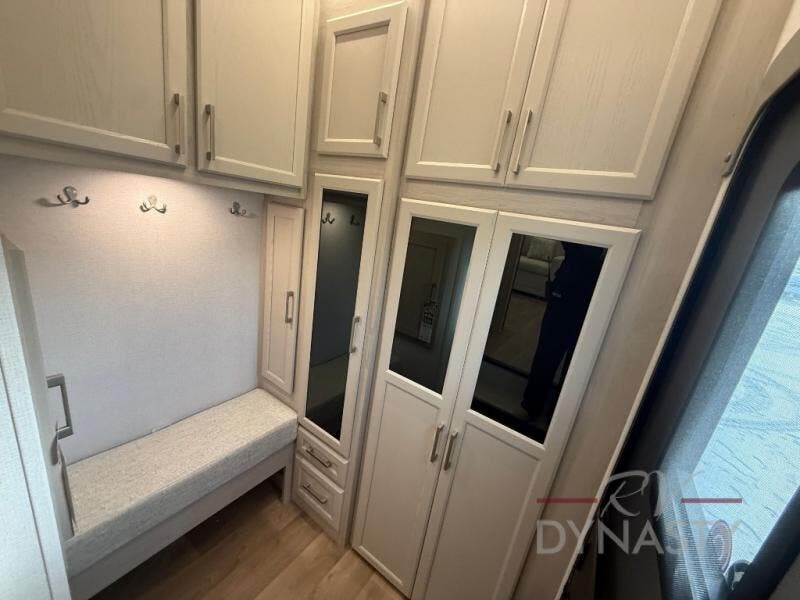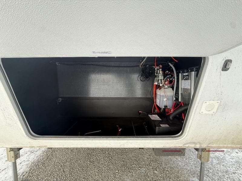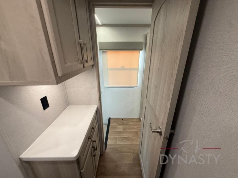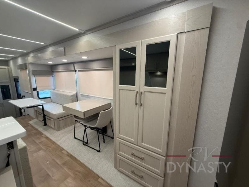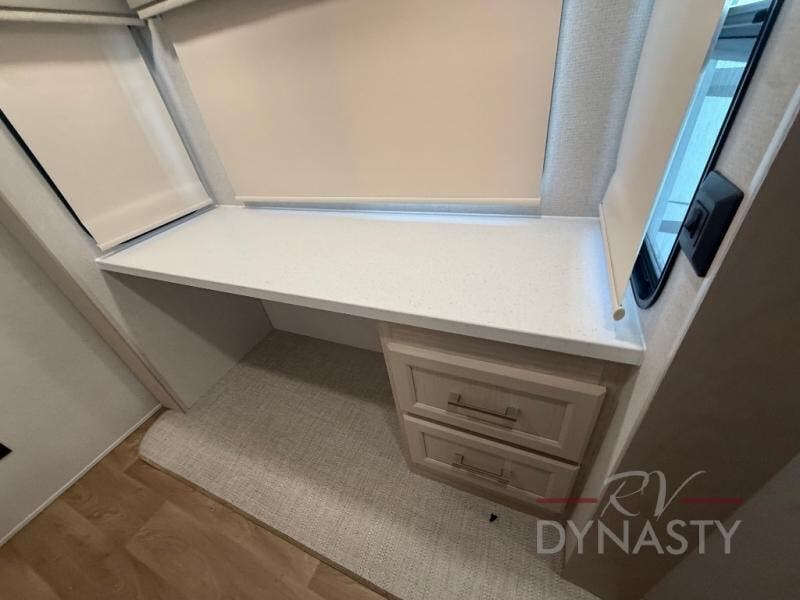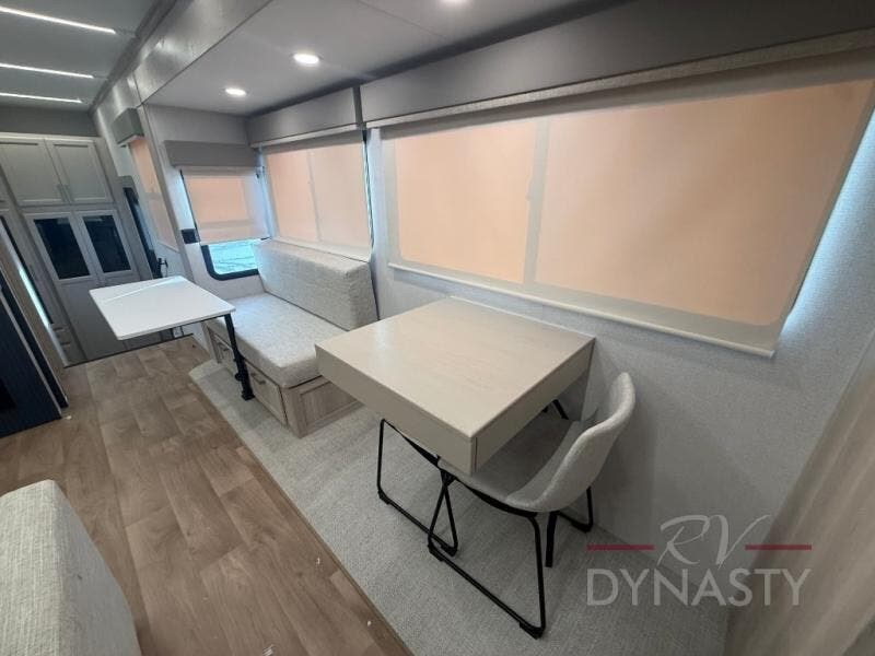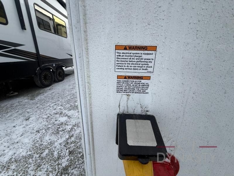 You will love every minute spent in this unique fifth wheel! As you enter the unit, you'll find a mud room with a bench seat, storage, plus washer and dryer prep. The front master bedroom will be your own oasis each day since there is an office space with a desk slide out and a hallway that leads to the front bedroom. Here, you'll find a king bed slide, a front bench, plus a slide out with a TV, fireplace and wardrobe; how convenient! When you've worked up an appetite, the rear kitchen includes everything you need to make home-cooked meals, along with a bar top that overlooks the living room, a spacious pantry, and a table with chairs to dine at. You can spend your evenings relaxing on the L-lounge by the entertainment center with a fireplace, or you can head outdoors to sit under the 19' power awning with LED lights!
