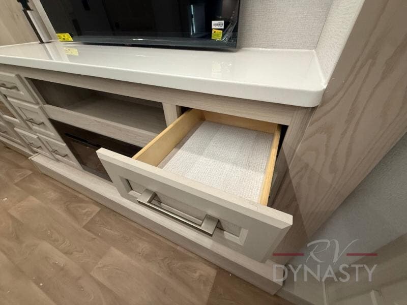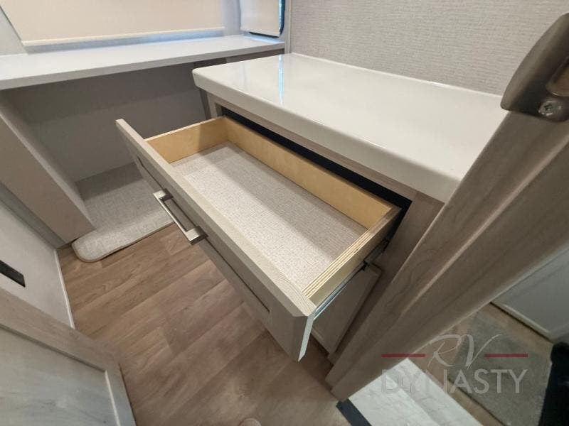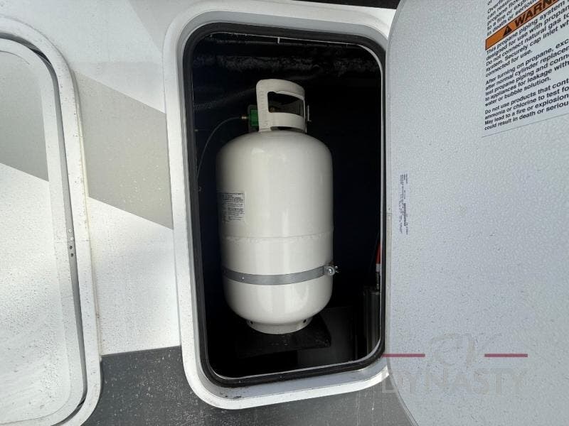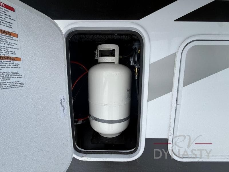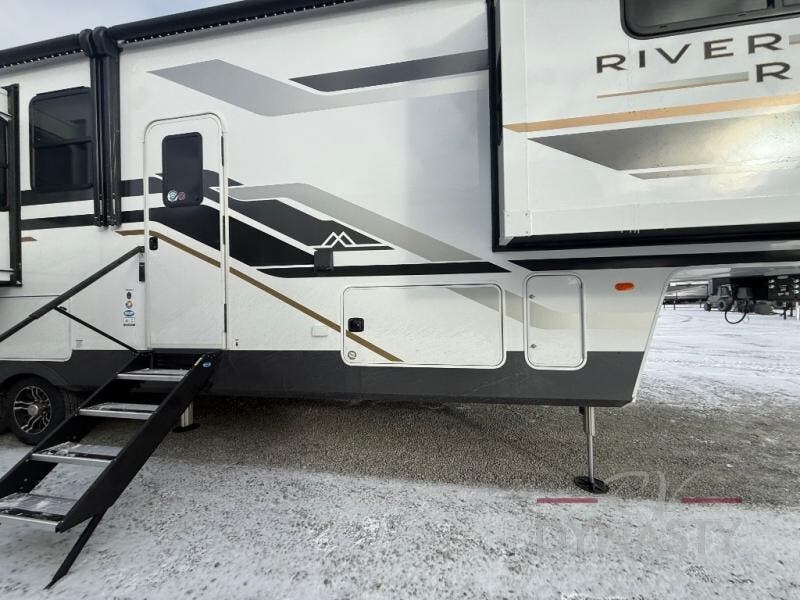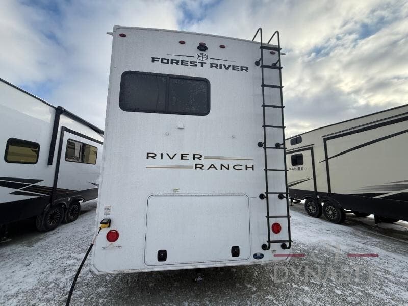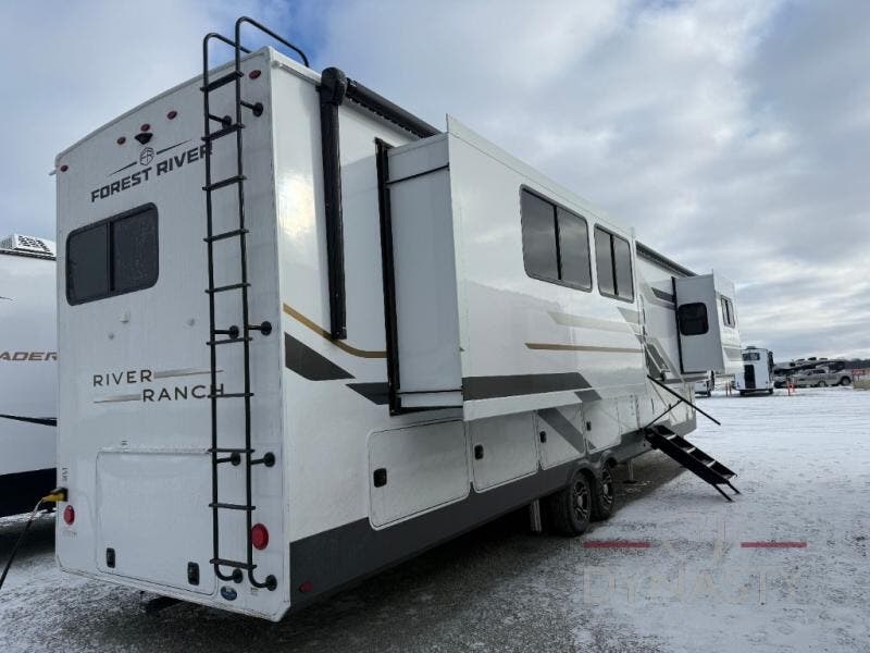 With the River Ranch fifth wheel by Forest River, you will love the practical living, ample storage, the optimum towability, and the lavish style found throughout! There is a 7' interior height and a 101" wide body for added space, plus large, tinted windows throughout, worry-free composite floors, and vacuum bonded walls with Azdel for durability. The mandatory River Package includes features such as an upgraded suspension, a screenless operating system with Bluetooth, and three A/C units to keep you comfortable. These fifth wheels also include the mandatory Ranch Package that comes with a stainless-steel appliance package, day/night roller shades, a fiberglass shower surround, plus residential style dinette chairs. There are many more features to love about the River Ranch fifth wheels, like the upgraded true solid surface countertops, the mirrored sliding closet doors, and the two-tone painted front cap!