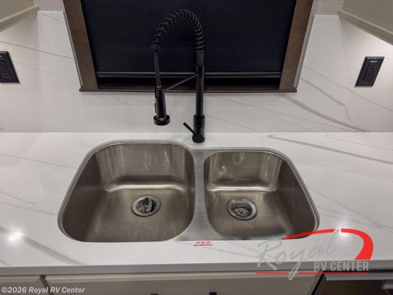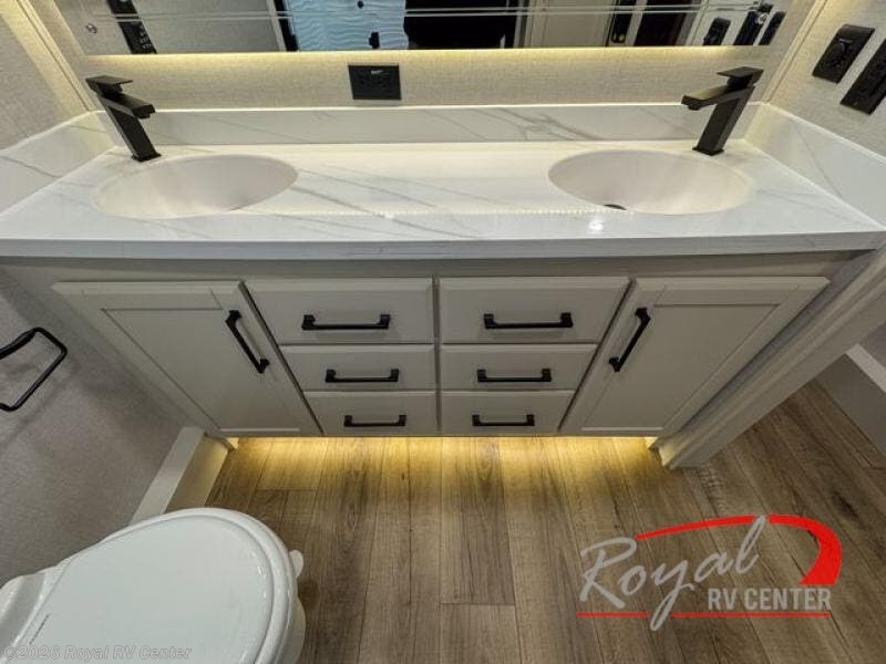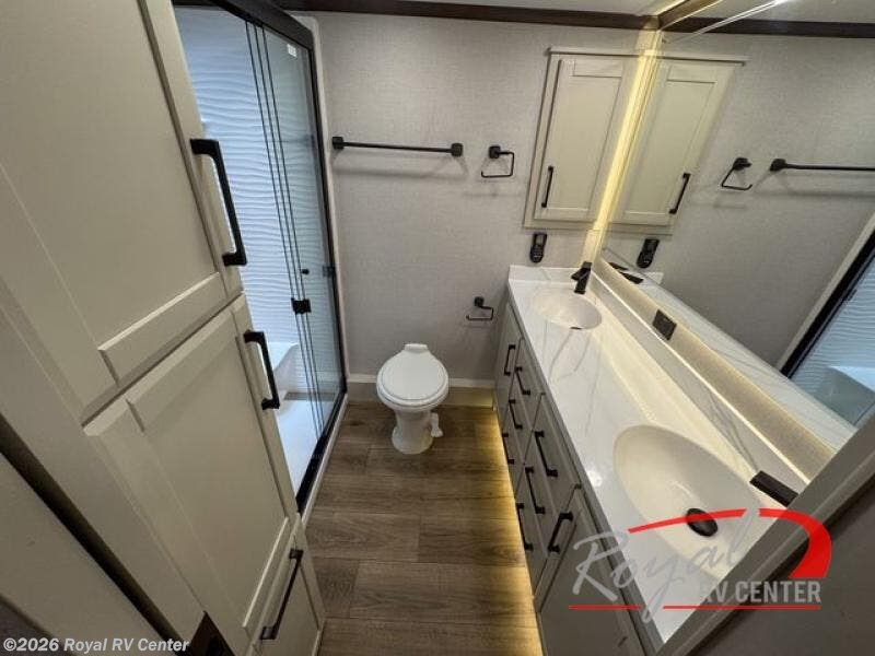 The large bathroom includes a dual vanity sink, providing convenience and personal space for couples. Premium finishes elevate your daily routine and make this fifth wheel feel like a high-end suite.