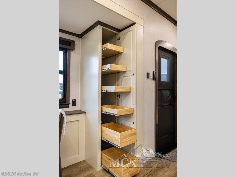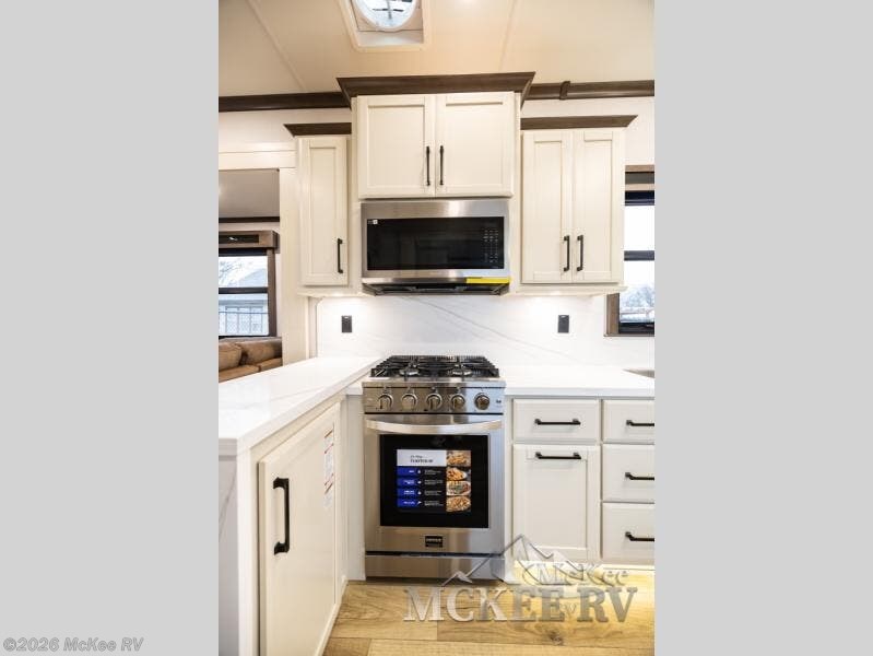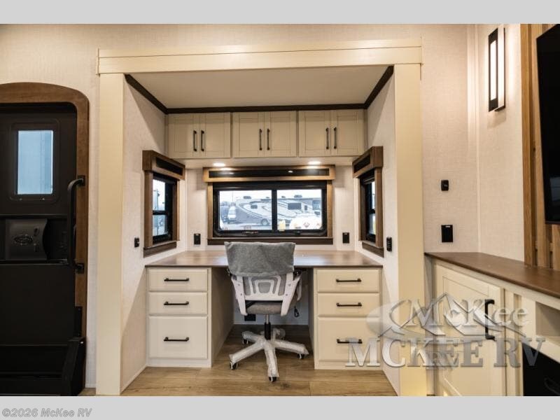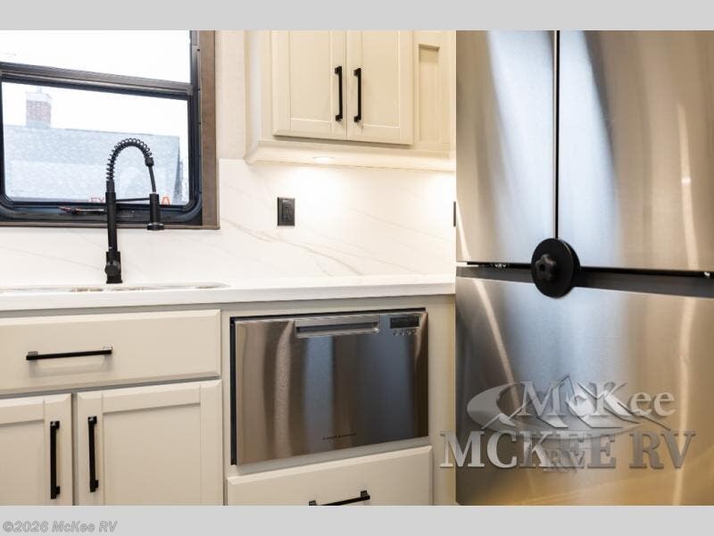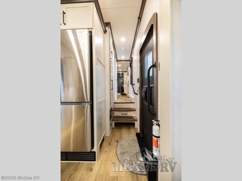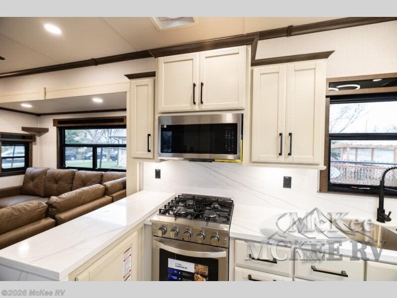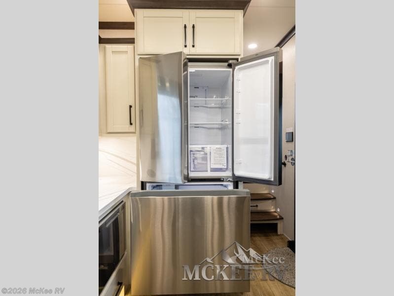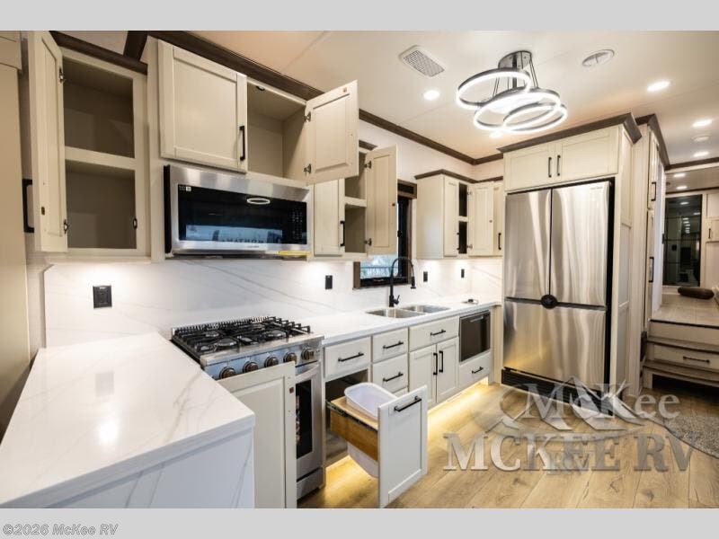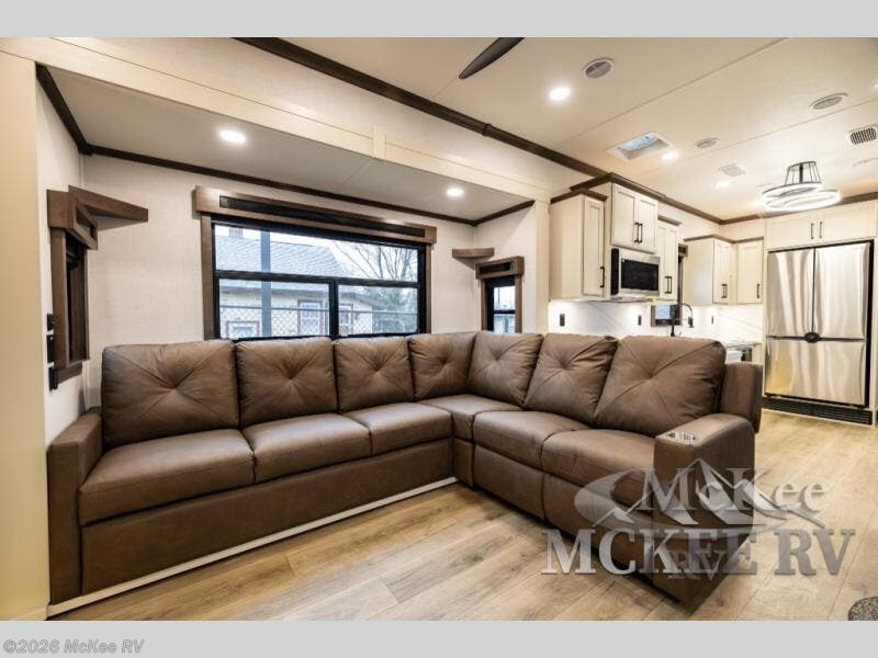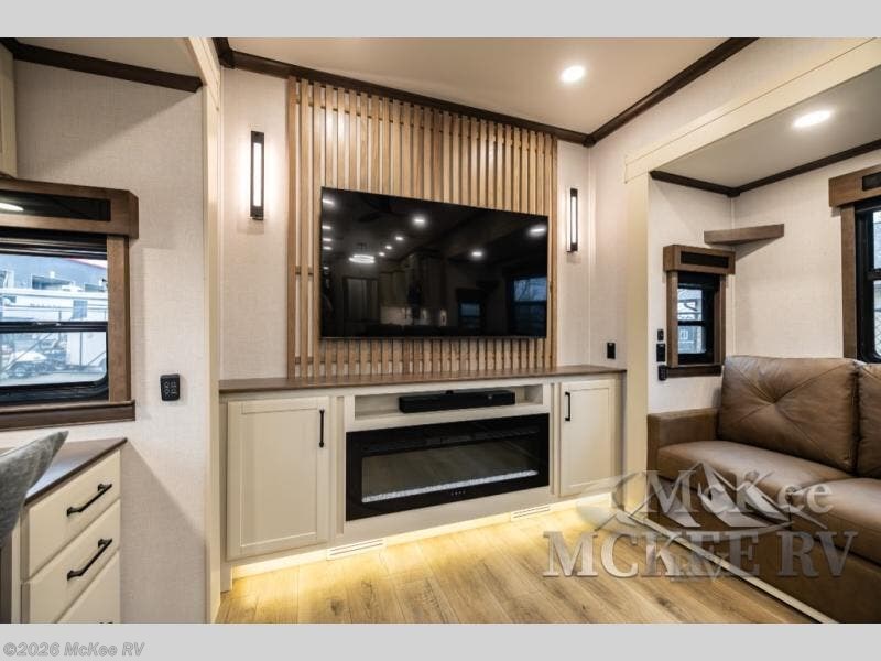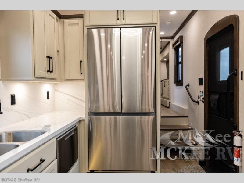 Step into luxury with this fifth wheel, where a high-end design, smart amenities, and functional living combine for an unmatched fifth wheel experience. As you enter you will find yourself in a spacious Kitchen for serious cooking: solid surface countertops, a full 18 cu. ft. french door refrigerator with ice maker, large stainless steel sink and residential-style faucet. Find yourself five slides that will create room for comfortable seating while you cozy up by the fireplace and watch your favorite movie or be as productive as you'd like with the slide out desk space. After a long day of travelling you will surely love to the front bedroom featuring a 72 x 80 king bed to finish your day with a good night's sleep.