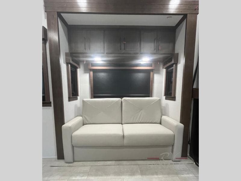 You will feel right at home in this fifth wheel! The rear private bedroom has a 72" x 80" king bed slide for a good night's rest, a rear large wardrobe with the washer and dryer next to it, and even a dresser with a 40" LED TV. Two can get ready at once in the full bathroom with the dual sink vanity then head to either the desk slide to get some work done or whip up some scrambled eggs on the three burner cooktop at the island in the front kitchen. The kitchen even has a dishwasher for easy clean up and two bar stools at the high top dinette that overlooks the middle living area. Relax each night in true comfort on either the E-Z Glide sofa bed slide or the theater seating across from the entertainment center which has a fireplace and 65" Samsung LED Smart TV to watch your favorite movies!