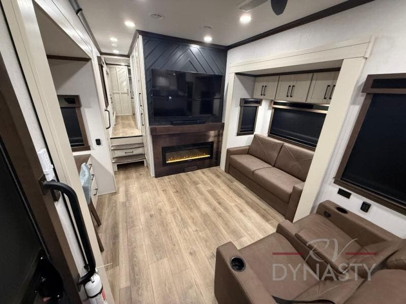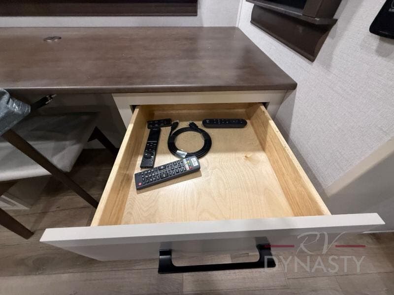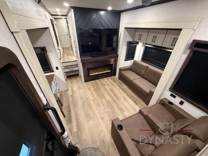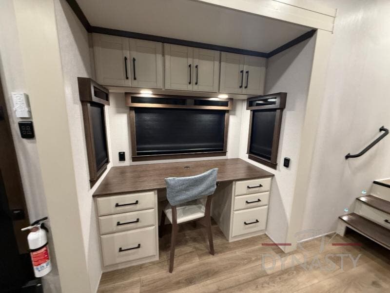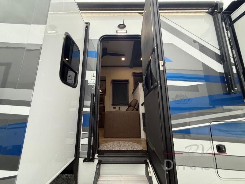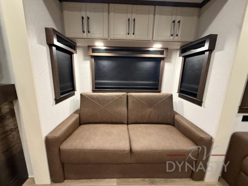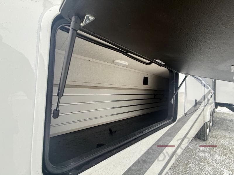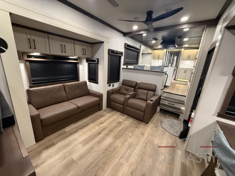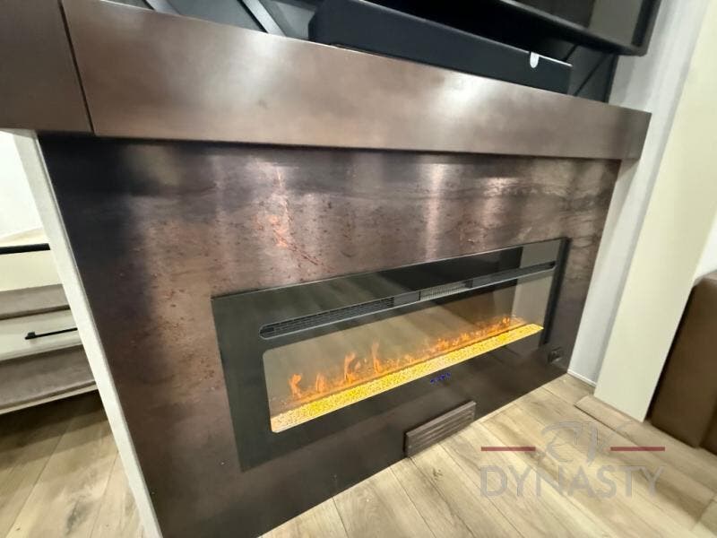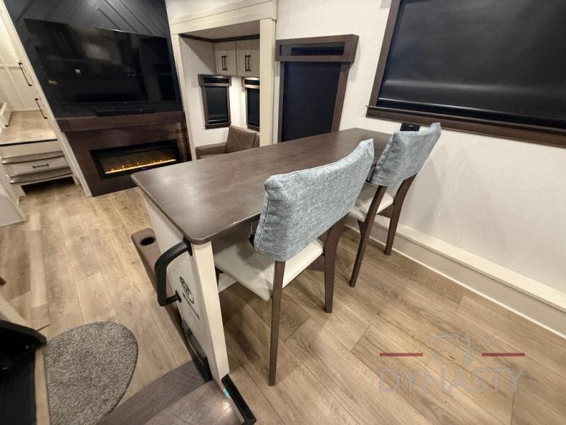 You will feel right at home in this fifth wheel! The rear private bedroom has a 72" x 80" king bed slide for a good night's rest, a rear large wardrobe with the washer and dryer next to it, and even a dresser with a 40" LED TV. And two can get ready at once in the full bathroom with the dual sink vanity. You can then head to either the desk slide to get some work done or whip up some scrambled eggs on the three burner cooktop at the island in the front kitchen. The kitchen even has a dishwasher for easy clean up and two bar stools at the high top dinette that overlooks the middle living area. Relax each night in true comfort on either the E-Z Glide sofa bed slide or the theater seating across from the entertainment center which has a fireplace and 65" Samsung LED Smart TV to watch your favorite movies!