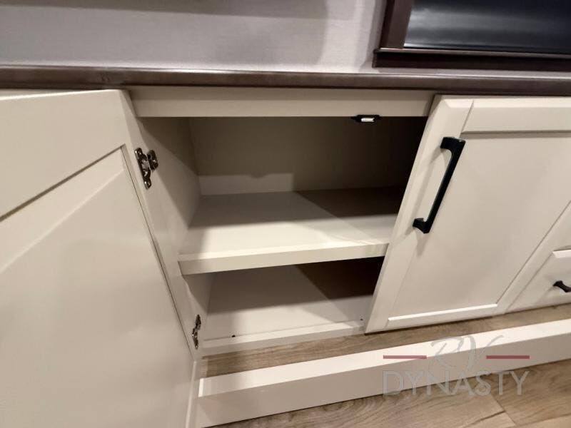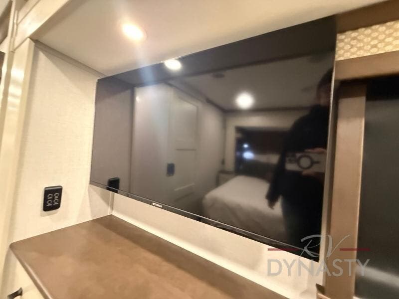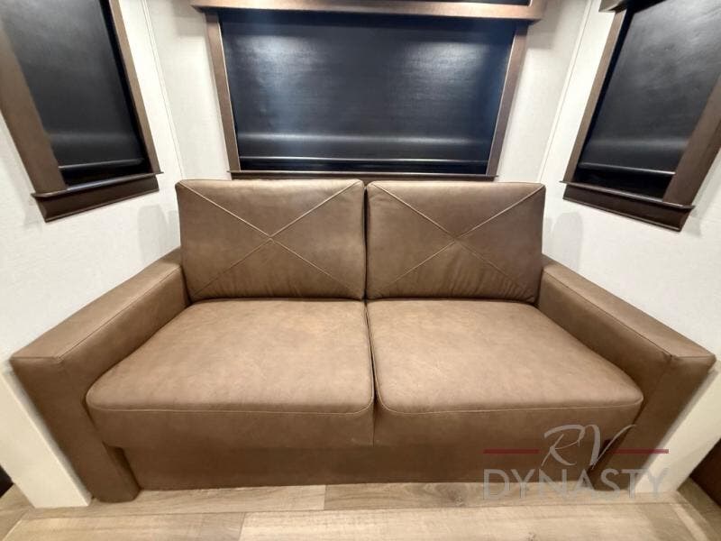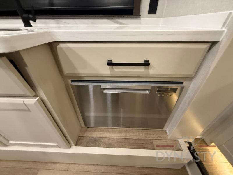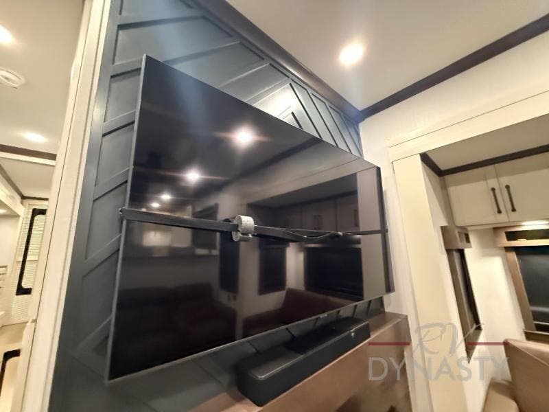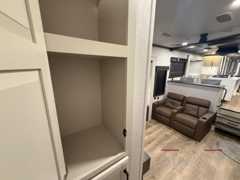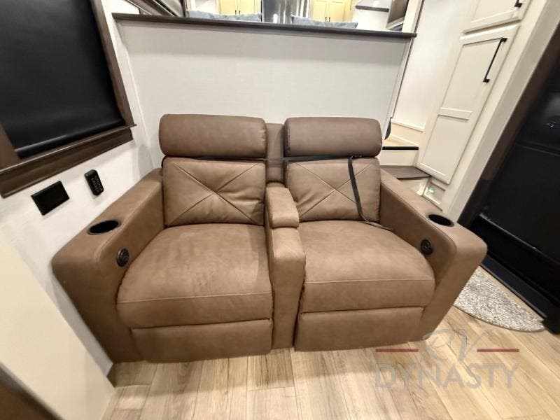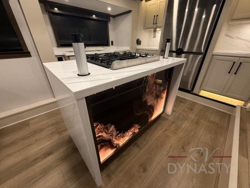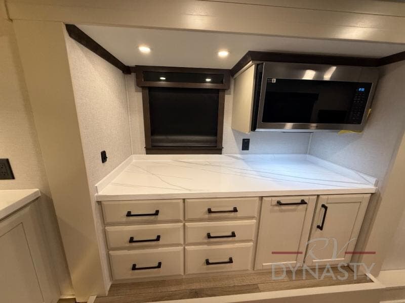 You will feel right at home in this fifth wheel! The rear private bedroom has a 72" x 80" king bed slide for a good night's rest, a rear large wardrobe with the washer and dryer next to it, and even a dresser with a 40" LED TV. And two can get ready at once in the full bathroom with the dual sink vanity. You can then head to either the desk slide to get some work done or whip up some scrambled eggs on the three burner cooktop at the island in the front kitchen. The kitchen even has a dishwasher for easy clean up and two bar stools at the high top dinette that overlooks the middle living area. Relax each night in true comfort on either the E-Z Glide sofa bed slide or the theater seating across from the entertainment center which has a fireplace and 65" Samsung LED Smart TV to watch your favorite movies!