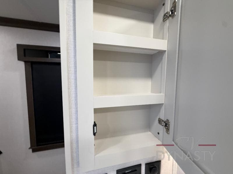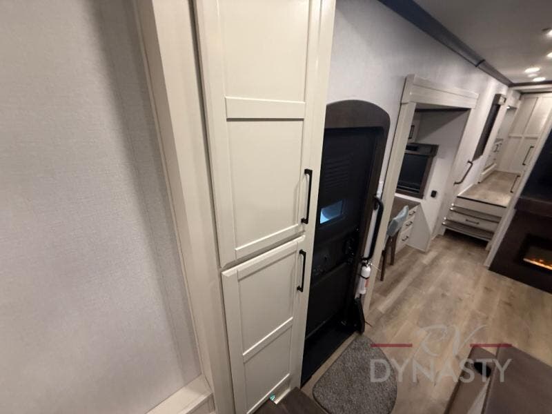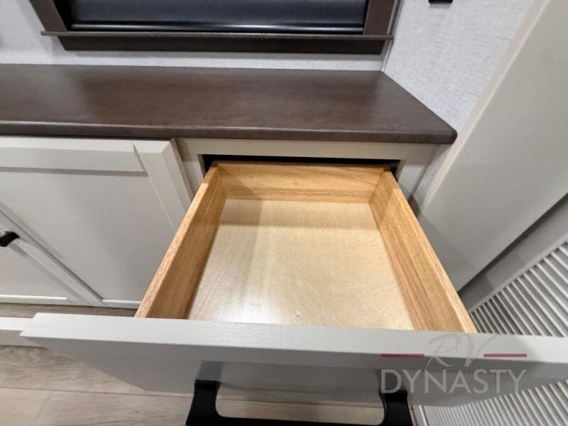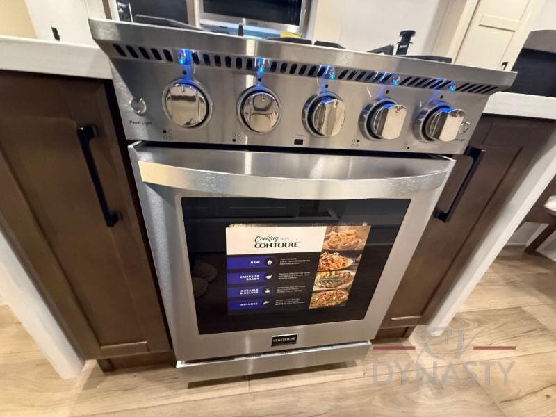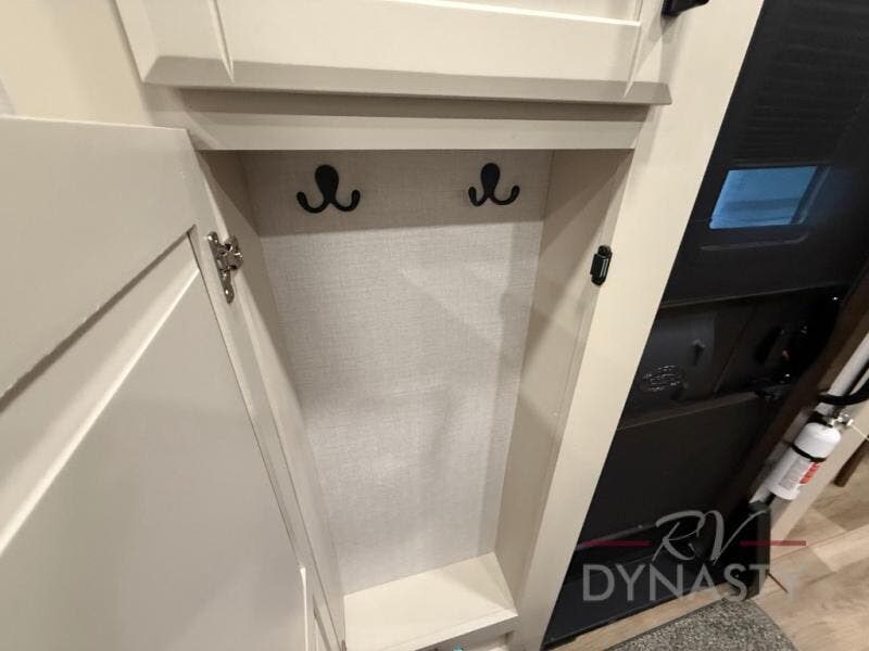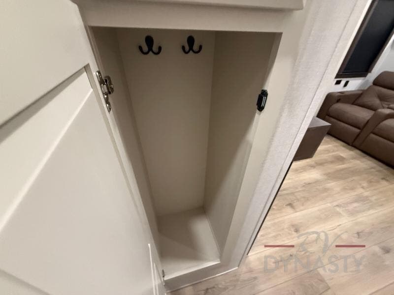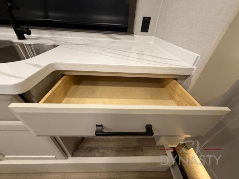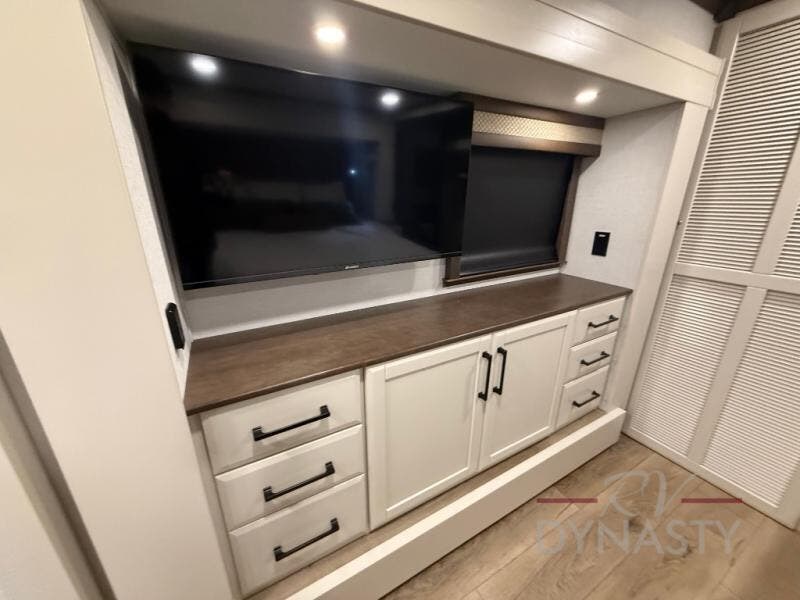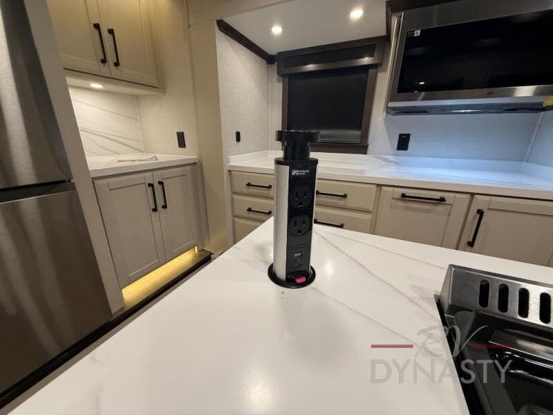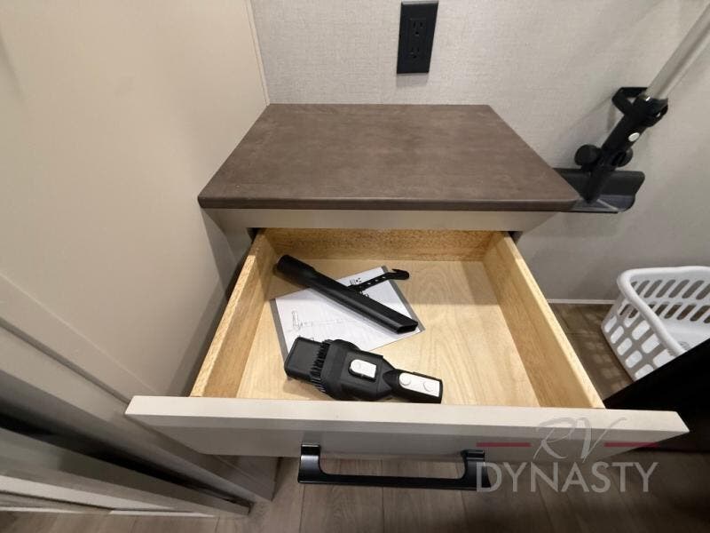 You will feel right at home in this fifth wheel! The rear private bedroom has a 72" x 80" king bed slide for a good night's rest, a rear large wardrobe with the washer and dryer next to it, and even a dresser with a 40" LED TV. And two can get ready at once in the full bathroom with the dual sink vanity. You can then head to either the desk slide to get some work done or whip up some scrambled eggs on the three burner cooktop at the island in the front kitchen. The kitchen even has a dishwasher for easy clean up and two bar stools at the high top dinette that overlooks the middle living area. Relax each night in true comfort on either the E-Z Glide sofa bed slide or the theater seating across from the entertainment center which has a fireplace and 65" Samsung LED Smart TV to watch your favorite movies!