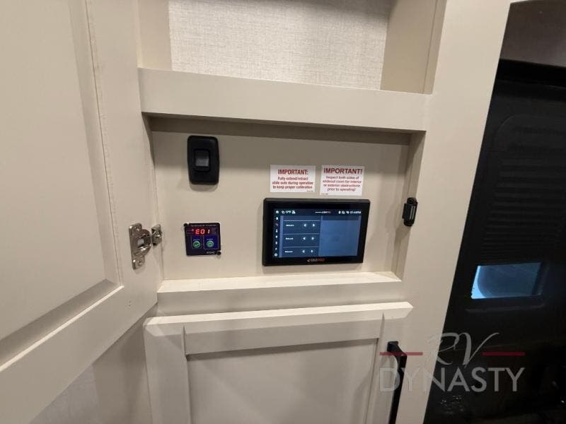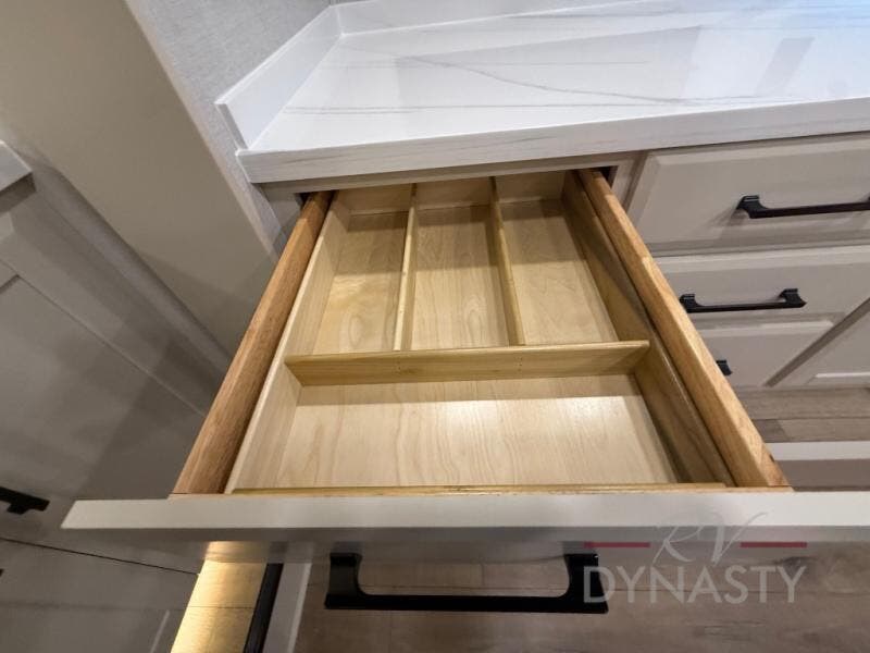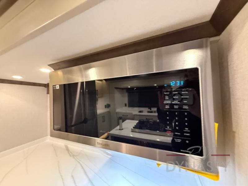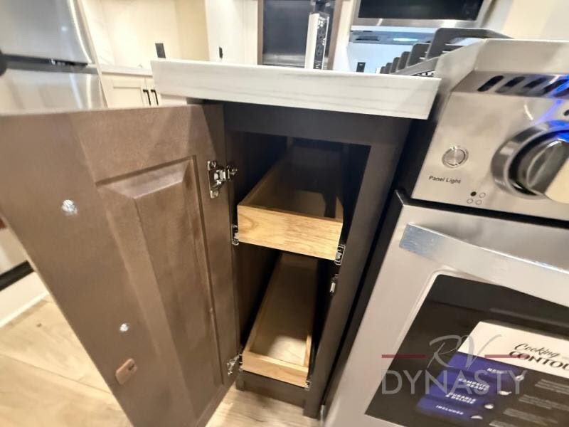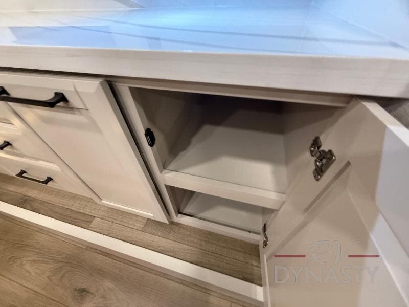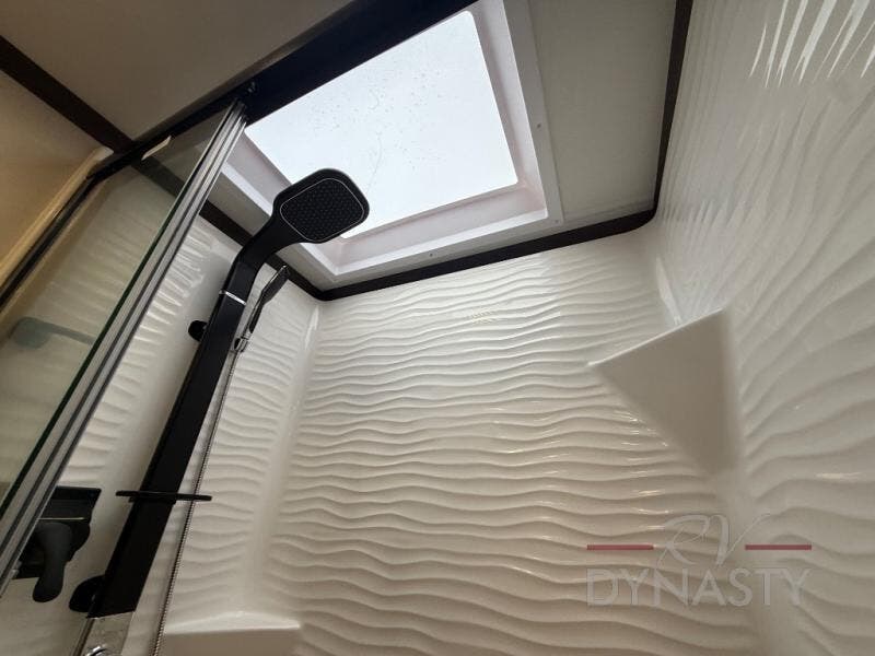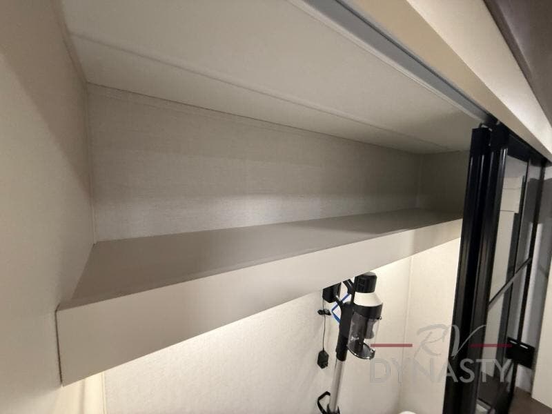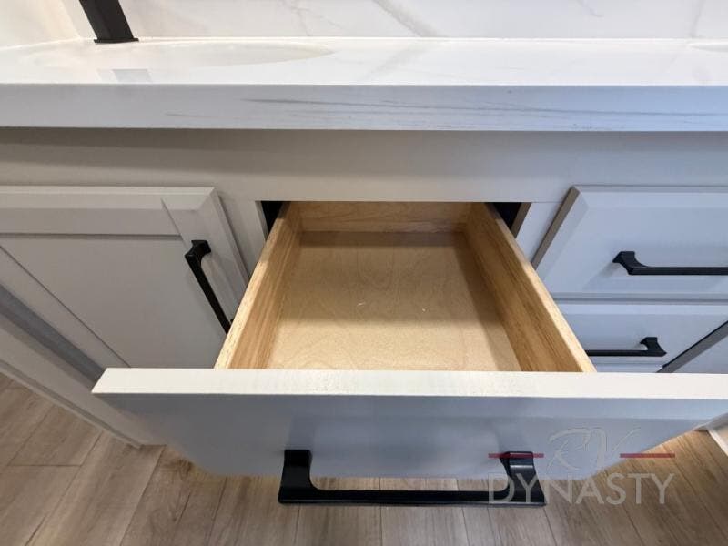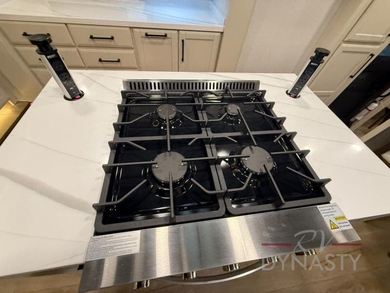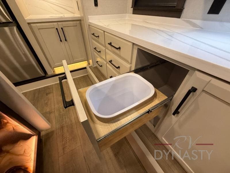 You will feel right at home in this fifth wheel! The rear private bedroom has a 72" x 80" king bed slide for a good night's rest, a rear large wardrobe with the washer and dryer next to it, and even a dresser with a 40" LED TV. And two can get ready at once in the full bathroom with the dual sink vanity. You can then head to either the desk slide to get some work done or whip up some scrambled eggs on the three burner cooktop at the island in the front kitchen. The kitchen even has a dishwasher for easy clean up and two bar stools at the high top dinette that overlooks the middle living area. Relax each night in true comfort on either the E-Z Glide sofa bed slide or the theater seating across from the entertainment center which has a fireplace and 65" Samsung LED Smart TV to watch your favorite movies!