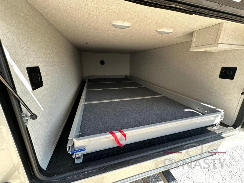 You will feel right at home in this fifth wheel! The rear private bedroom has a 72" x 80" king bed slide for a good night's rest, a rear large wardrobe with the washer and dryer next to it, and even a dresser with a 40" LED TV. And two can get ready at once in the full bathroom with the dual sink vanity. You can then head to either the desk slide to get some work done or whip up some scrambled eggs on the three burner cooktop at the island in the front kitchen. The kitchen even has a dishwasher for easy clean up and two bar stools at the high top dinette that overlooks the middle living area. Relax each night in true comfort on either the E-Z Glide sofa bed slide or the theater seating across from the entertainment center which has a fireplace and 65" Samsung LED Smart TV to watch your favorite movies!