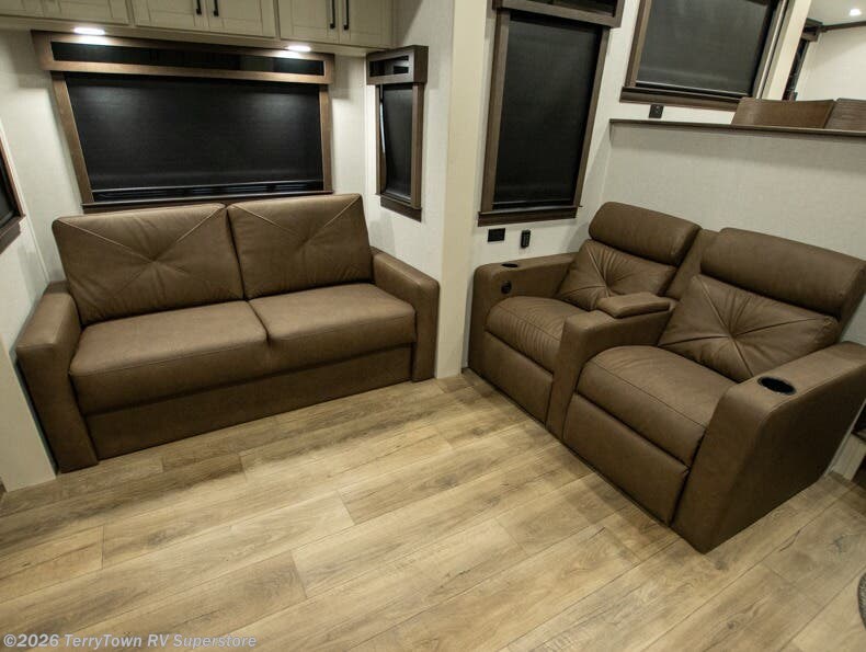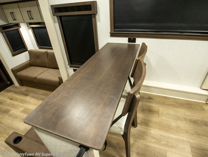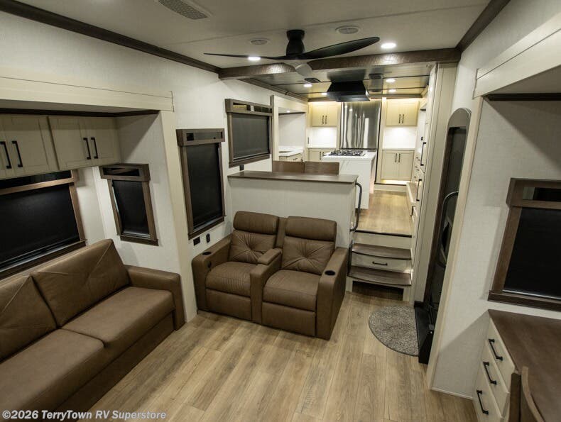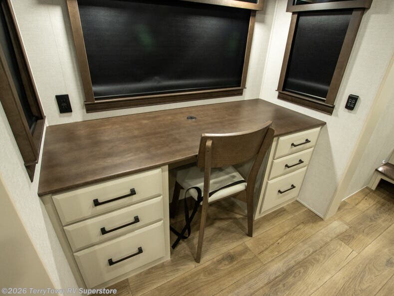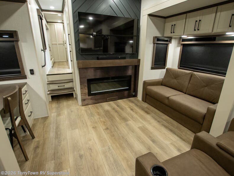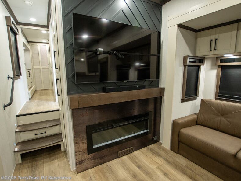You will feel right at home in this fifth wheel! The rear private bedroom has a 72" x 80" king bed slide for a good night's rest, a rear large wardrobe with the washer and dryer next to it, and even a dresser with a 40" LED TV. And two can get ready at once in the full bathroom with the dual sink vanity. You can then head to either the desk slide to get some work done or whip up some scrambled eggs on the three burner cooktop at the island in the front kitchen. The kitchen even has a dishwasher for easy clean up and two bar stools at the high top dinette that overlooks the middle living area. Relax each night in true comfort on either the E-Z Glide sofa bed slide or the theater seating across from the entertainment center which has a fireplace and 65" Samsung LED Smart TV to watch your favorite movies!