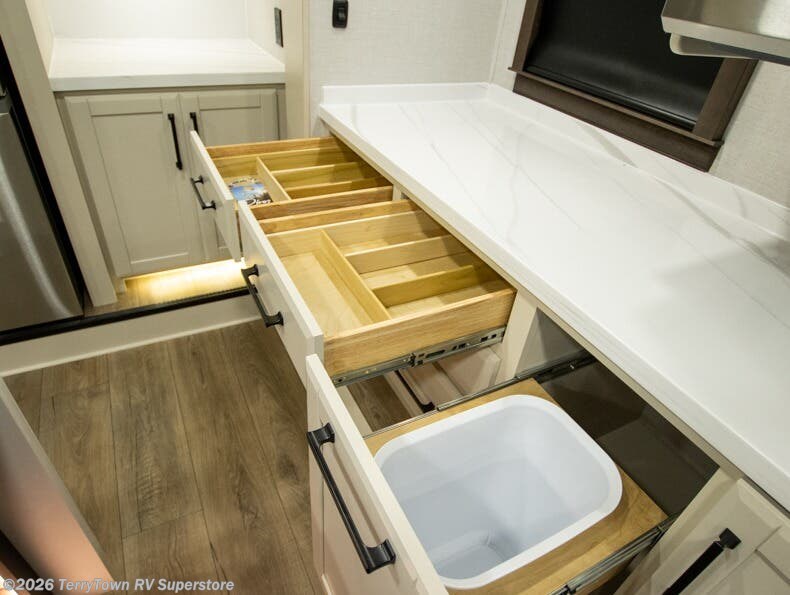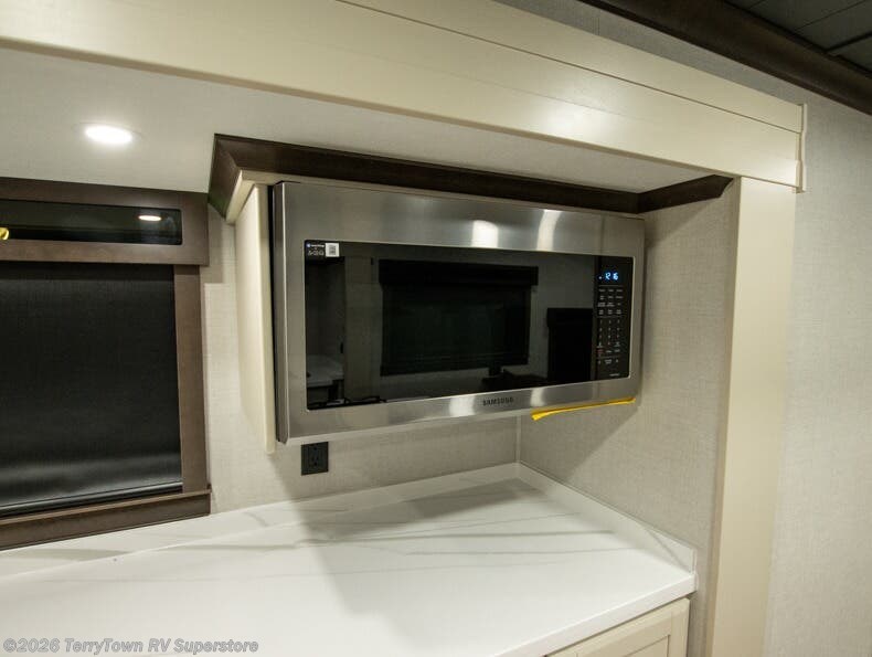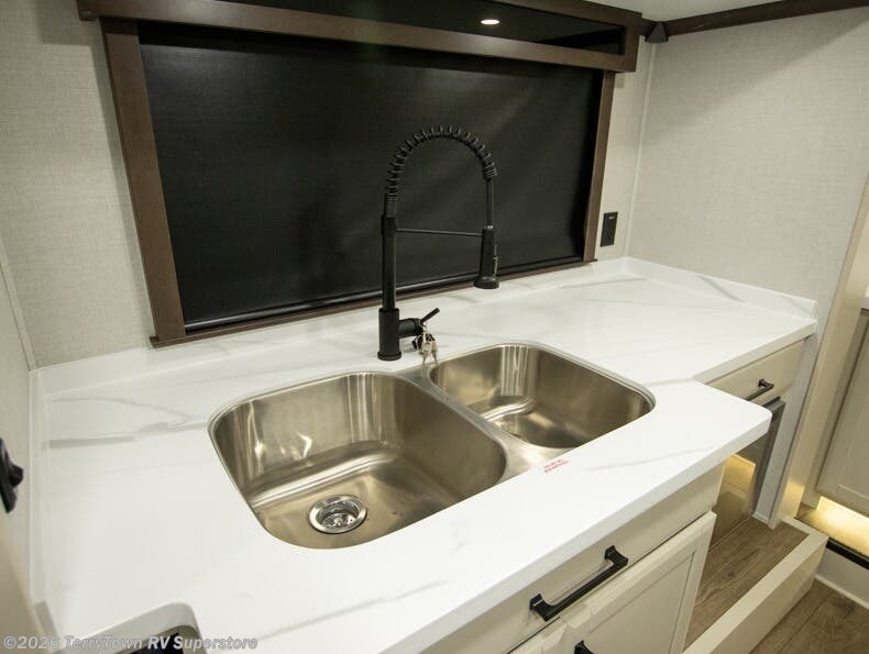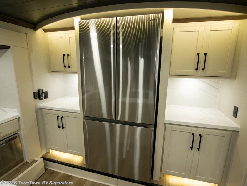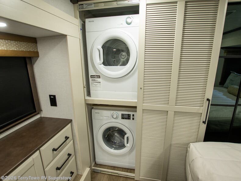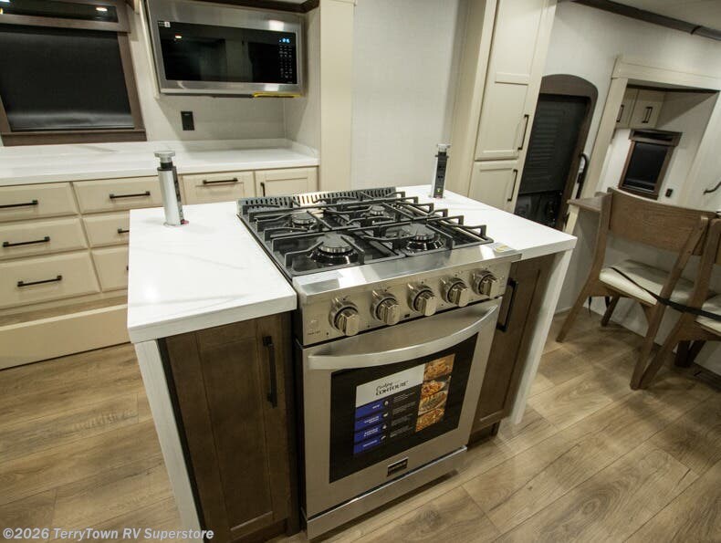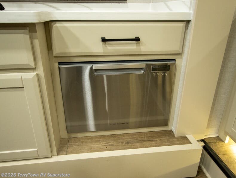 You will feel right at home in this fifth wheel! The rear private bedroom has a 72" x 80" king bed slide for a good night's rest, a rear large wardrobe with the washer and dryer next to it, and even a dresser with a 40" LED TV. And two can get ready at once in the full bathroom with the dual sink vanity. You can then head to either the desk slide to get some work done or whip up some scrambled eggs on the three burner cooktop at the island in the front kitchen. The kitchen even has a dishwasher for easy clean up and two bar stools at the high top dinette that overlooks the middle living area. Relax each night in true comfort on either the E-Z Glide sofa bed slide or the theater seating across from the entertainment center which has a fireplace and 65" Samsung LED Smart TV to watch your favorite movies!