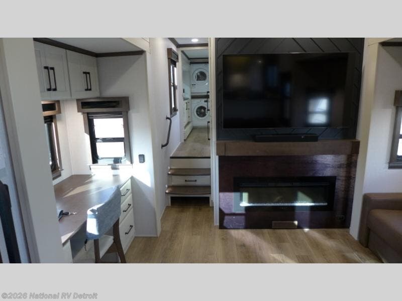 You will feel right at home in this fifth wheel! The rear private bedroom has a 72" x 80" king bed slide for a good night's rest, a rear large wardrobe with the washer and dryer next to it, and even a dresser with a 40" LED TV. And two can get ready at once in the full bathroom with the dual sink vanity. You can then head to either the desk slide to get some work done or whip up some scrambled eggs on the three burner cooktop at the island in the front kitchen. The kitchen even has a dishwasher for easy clean up and two bar stools at the high top dinette that overlooks the middle living area. Relax each night in true comfort on either the E-Z Glide sofa bed slide or the theater seating across from the entertainment center which has a fireplace and 65" Samsung LED Smart TV to watch your favorite movies!