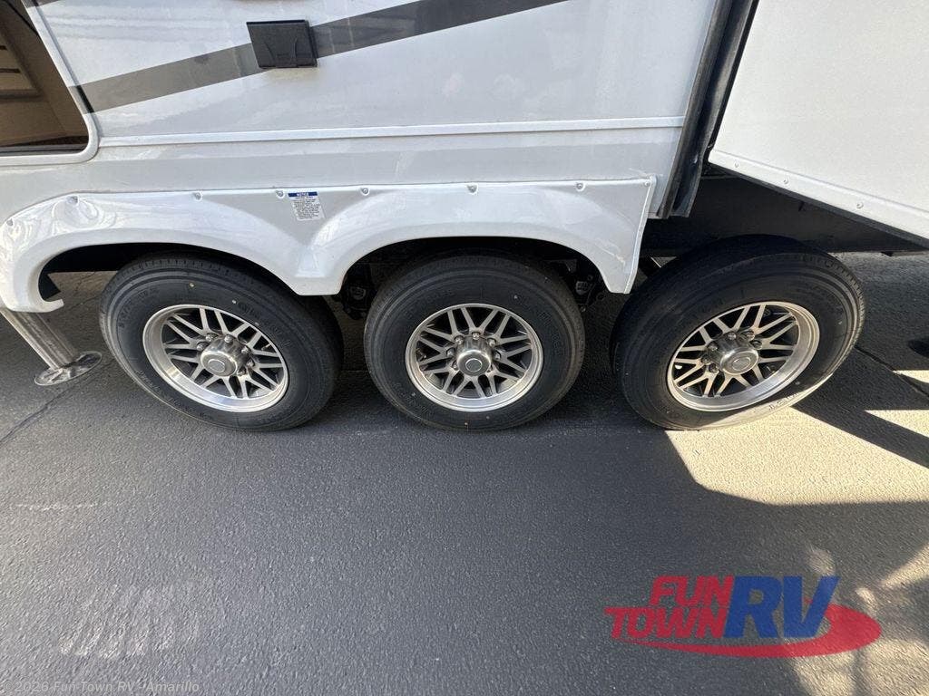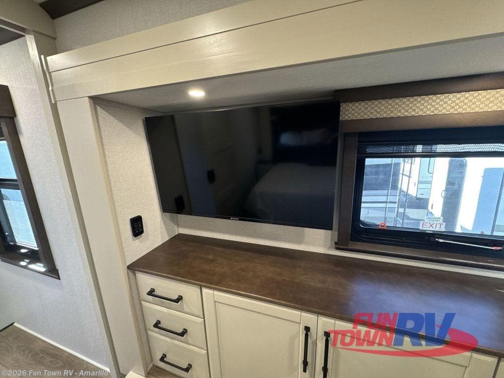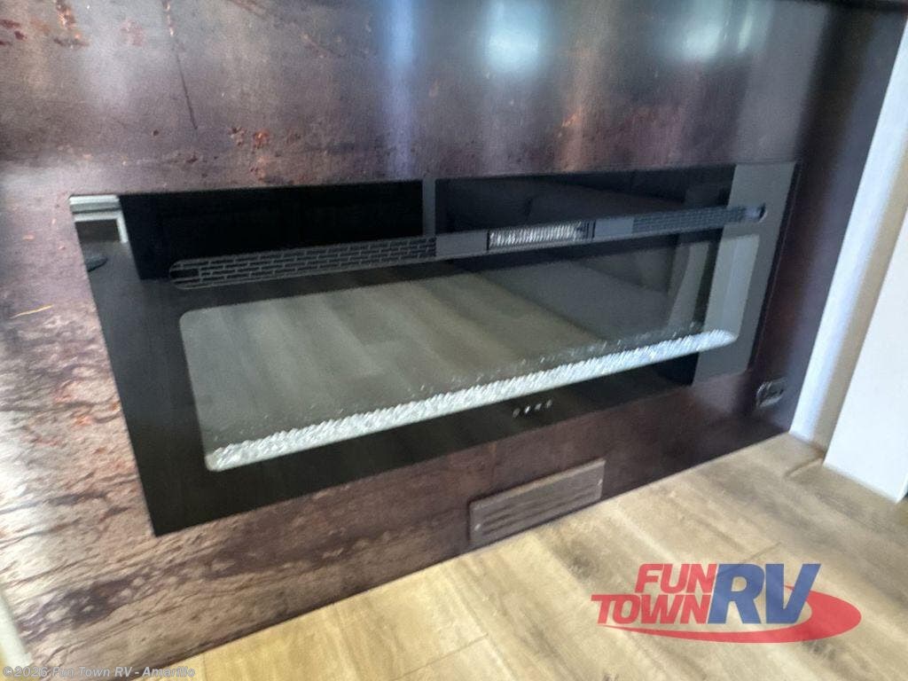You will feel right at home in this fifth wheel! The rear private bedroom has a 72" x 80" king bed slide for a good night's rest, a rear large wardrobe with the washer and dryer next to it, and even a dresser with a 40" LED TV. And two can get ready at once in the full bathroom with the dual sink vanity. You can then head to either the desk slide to get some work done or whip up some scrambled eggs on the three burner cooktop at the island in the front kitchen. The kitchen even has a dishwasher for easy clean up and two bar stools at the high top dinette that overlooks the middle living area. Relax each night in true comfort on either the E-Z Glide sofa bed slide or the theater seating across from the entertainment center which has a fireplace and 65" Samsung LED Smart TV to watch your favorite movies!