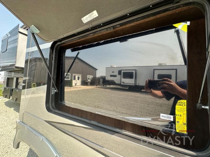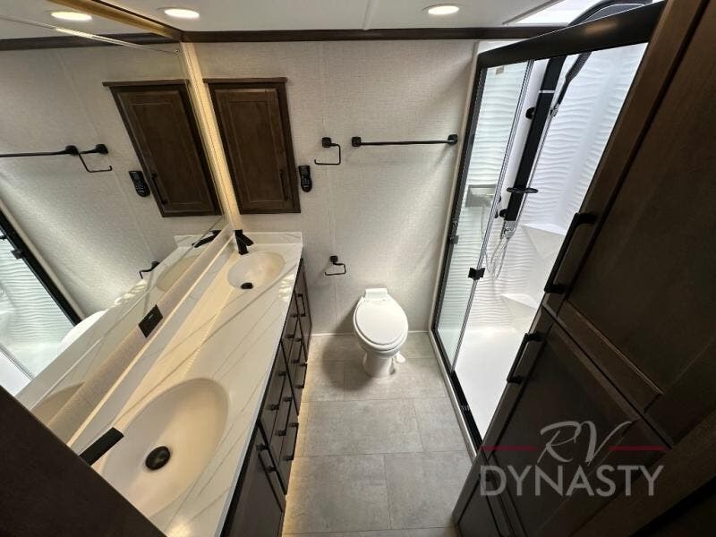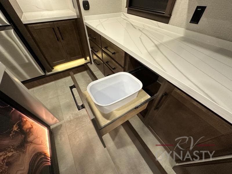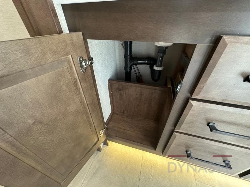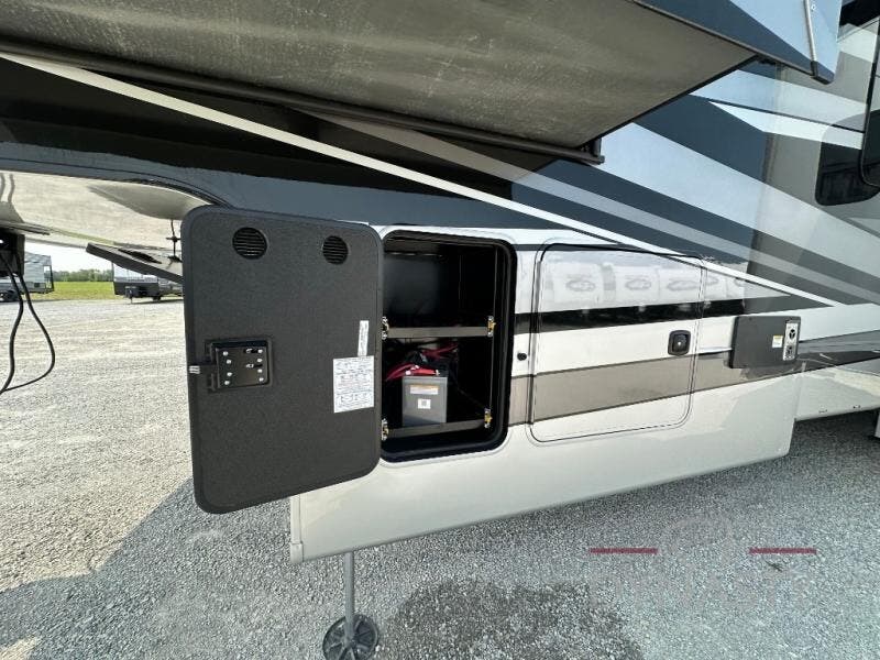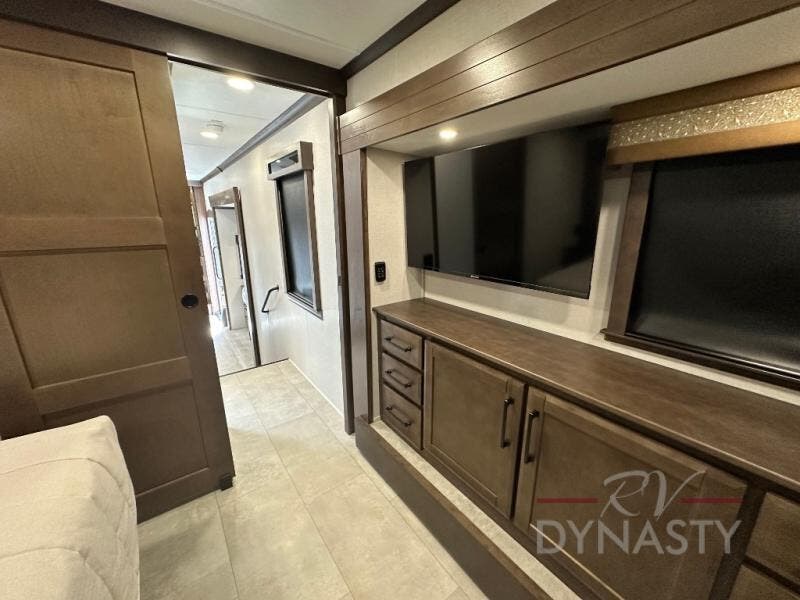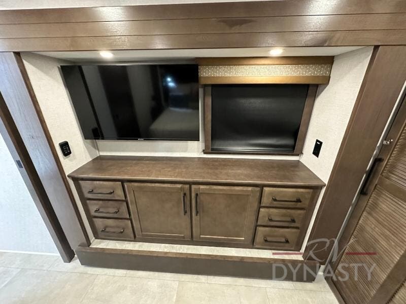 You will feel right at home in this fifth wheel! The rear private bedroom has a 72" x 80" king bed slide for a good night's rest, a rear large wardrobe with the washer and dryer next to it, and even a dresser with a 40" LED TV. And two can get ready at once in the full bathroom with the dual sink vanity. You can then head to either the desk slide to get some work done or whip up some scrambled eggs on the three burner cooktop at the island in the front kitchen. The kitchen even has a dishwasher for easy clean up and two bar stools at the high top dinette that overlooks the middle living area. Relax each night in true comfort on either the E-Z Glide sofa bed slide or the theater seating across from the entertainment center which has a fireplace and 65" Samsung LED Smart TV to watch your favorite movies!