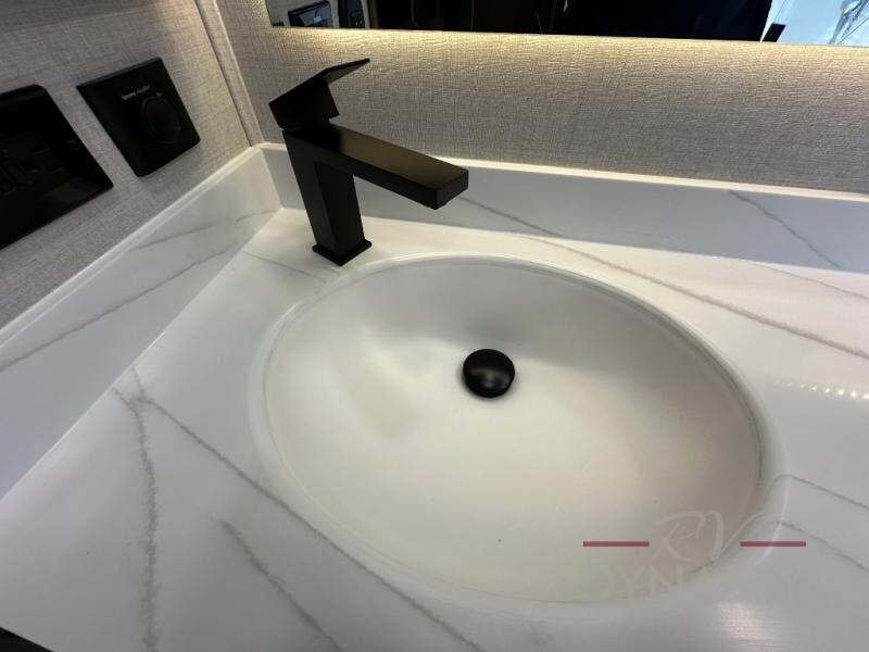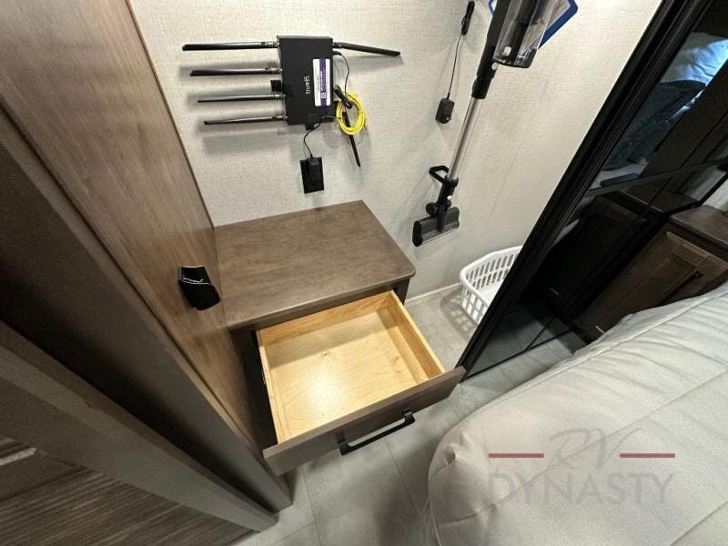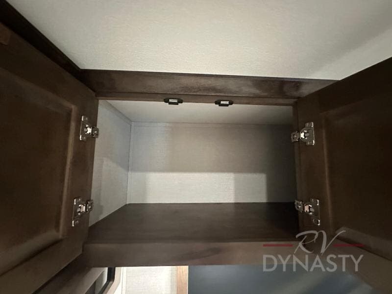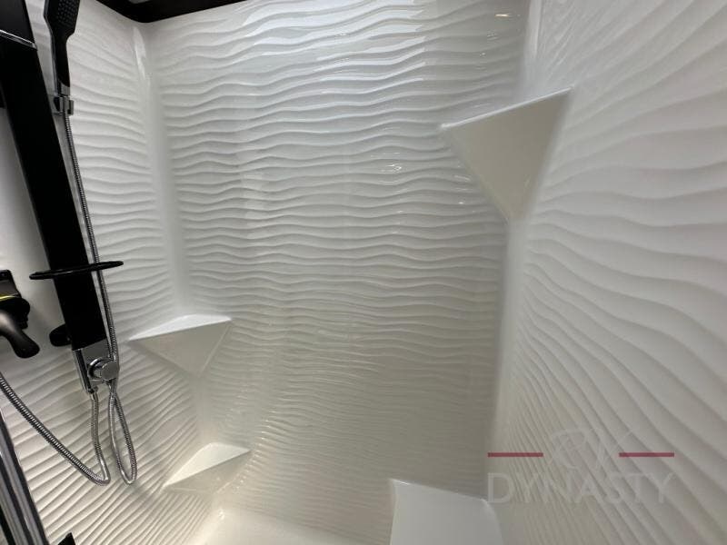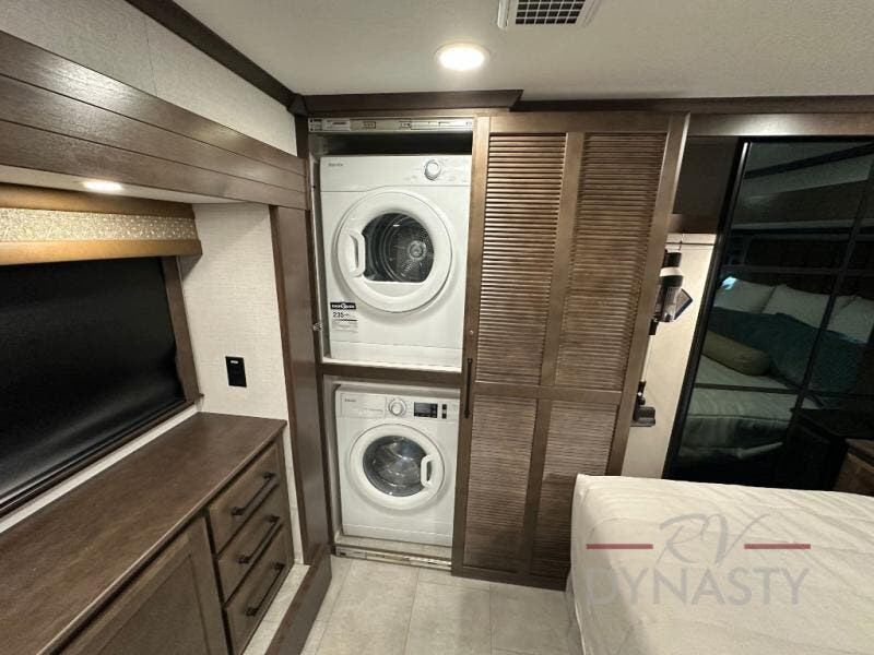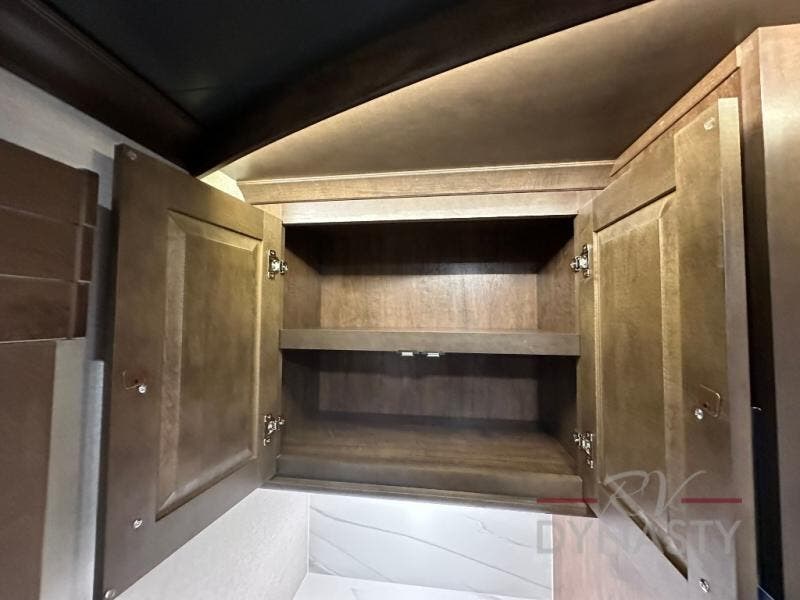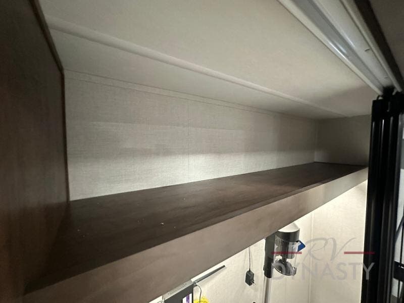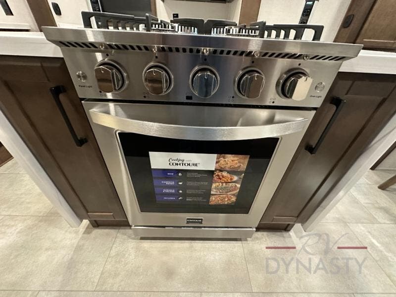 You will feel right at home in this fifth wheel! The rear private bedroom has a 72" x 80" king bed slide for a good night's rest, a rear large wardrobe with the washer and dryer next to it, and even a dresser with a 40" LED TV. And two can get ready at once in the full bathroom with the dual sink vanity. You can then head to either the desk slide to get some work done or whip up some scrambled eggs on the three burner cooktop at the island in the front kitchen. The kitchen even has a dishwasher for easy clean up and two bar stools at the high top dinette that overlooks the middle living area. Relax each night in true comfort on either the E-Z Glide sofa bed slide or the theater seating across from the entertainment center which has a fireplace and 65" Samsung LED Smart TV to watch your favorite movies!
