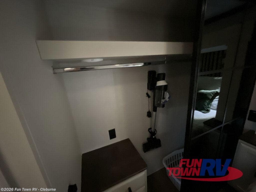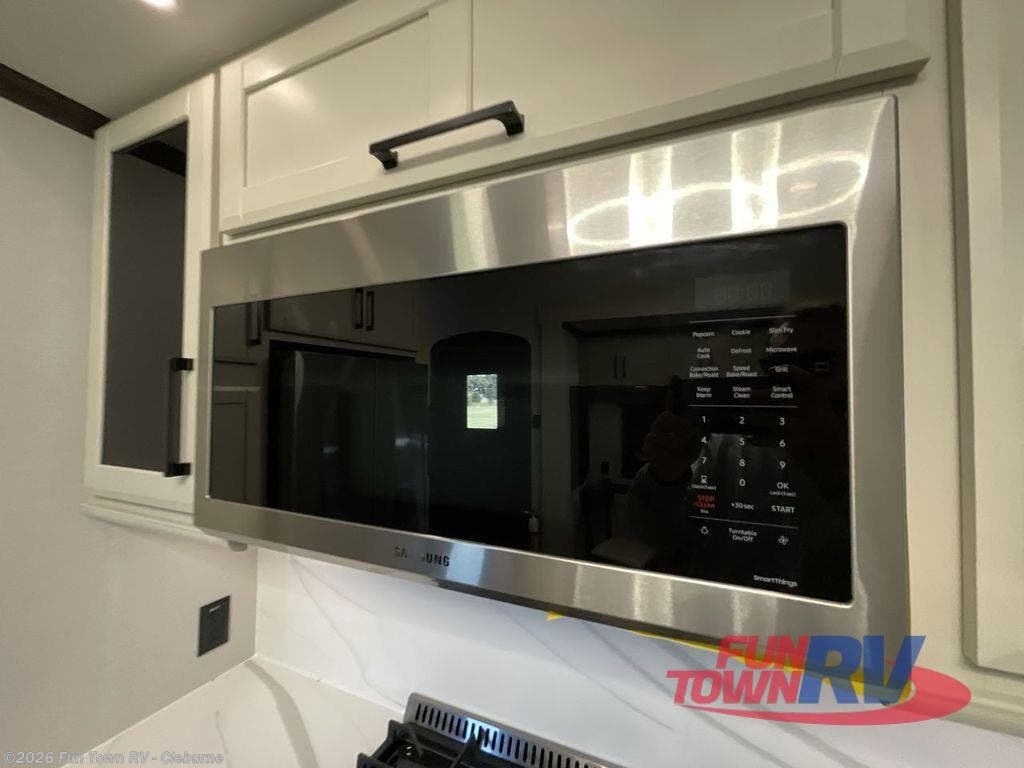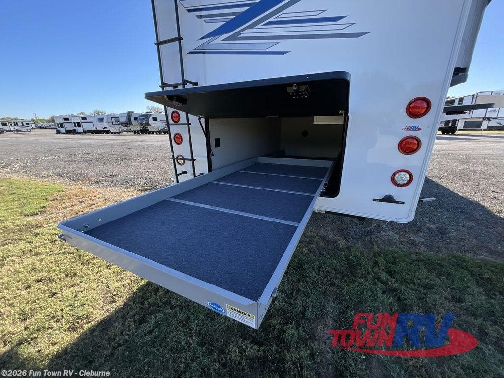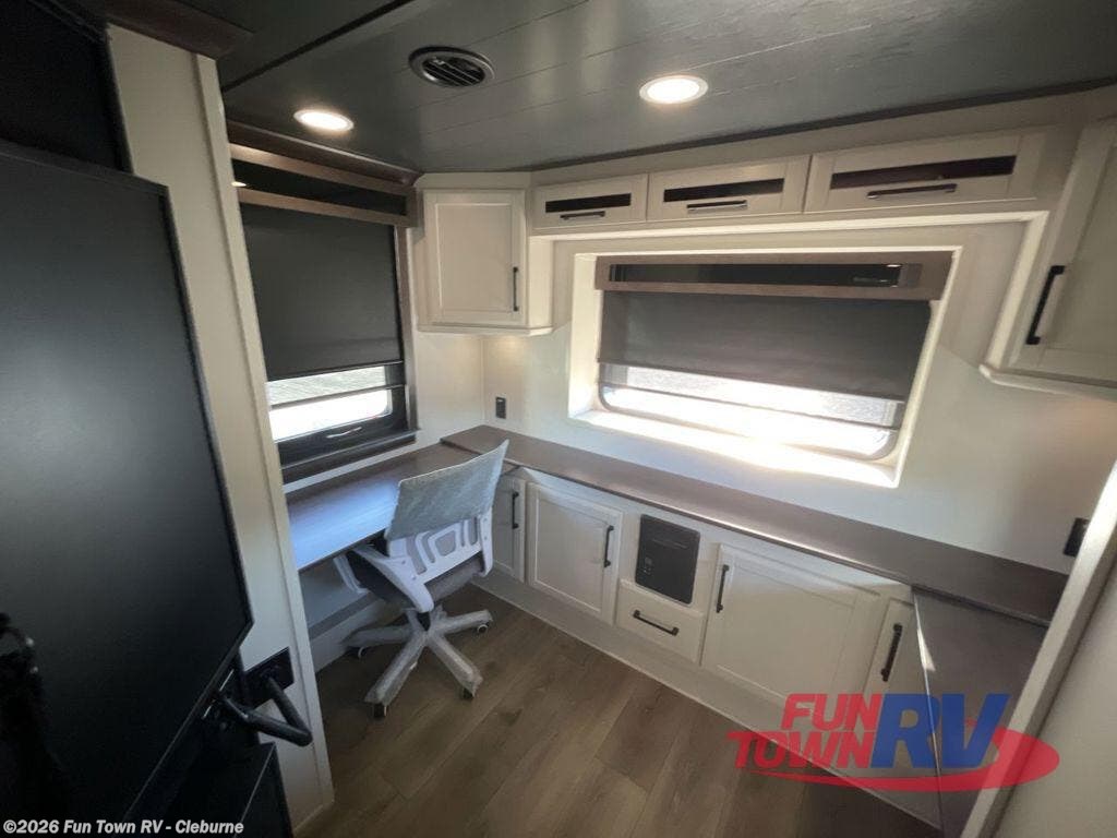 Pack your bags and head to your most comfortable camping trip ever in this packed out fifth wheel! The rear private bedroom has a 72" x 80" king bed slide for a good night's rest, a rear large wardrobe with the washer and dryer next to it, and even a dresser with a 40" LED TV. Get ready in the full bathroom with the shower then head to either the pull-out dinette to read the morning paper or whip up some scrambled eggs on the three burner cooktop in the middle kitchen. The kitchen even has two pantries for all your favorite snacks and a coat rack to hang your jacket. You can relax in the evenings on the two E-Z Glide sofa beds or the theater sofa across from the Samsung LED Smart TV. What's behind the swinging entertainment center is where the real convenience is found with this model; a hidden front office with ample counter space to get your work done!