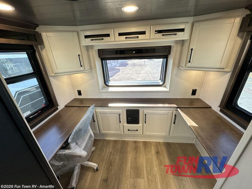 Pack your bags and head to your most comfortable camping trip ever in this packed out fifth wheel! The rear private bedroom has a 72" x 80" king bed slide for a good night's rest, a rear large wardrobe with the washer and dryer next to it, and even a dresser with a 40" LED TV. Get ready in the full bathroom with the shower then head to either the pull-out dinette to read the morning paper or whip up some scrambled eggs on the three burner cooktop in the middle kitchen. The kitchen even has two pantries for all your favorite snacks and a coat rack to hang your jacket. You can relax in the evenings on the two E-Z Glide sofa beds or the theater sofa across from the Samsung LED Smart TV. What's behind the swinging entertainment center is where the real convenience is found with this model; a hidden front office with ample counter space to get your work done!