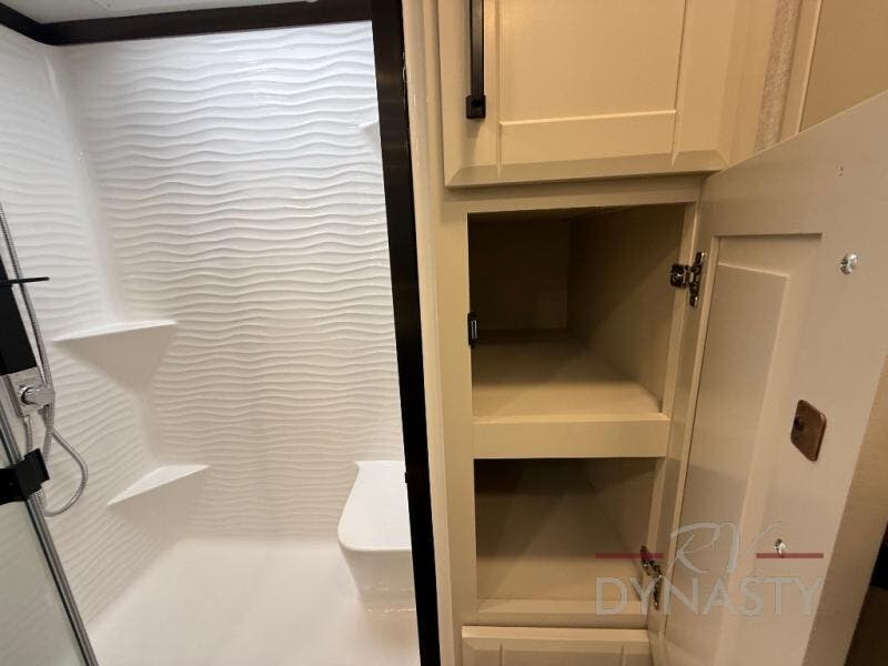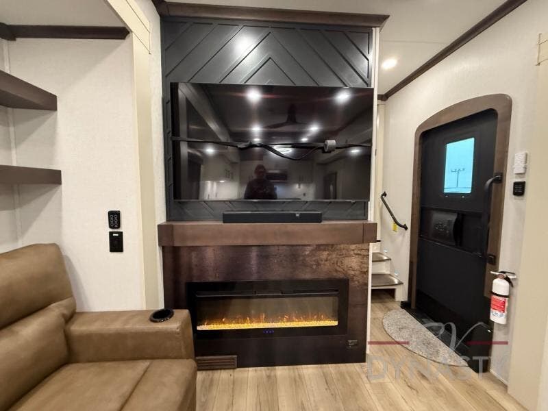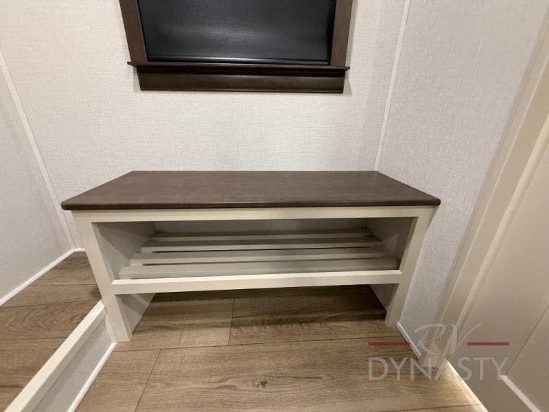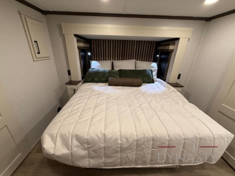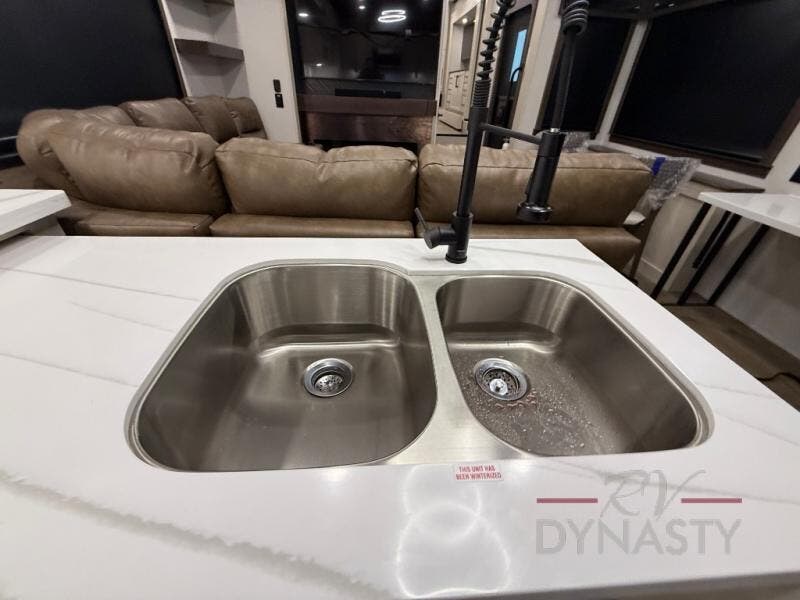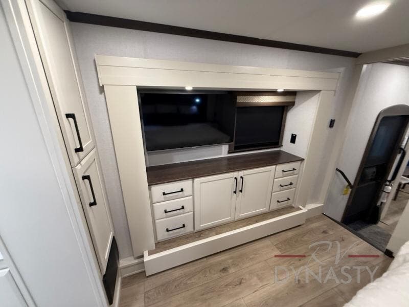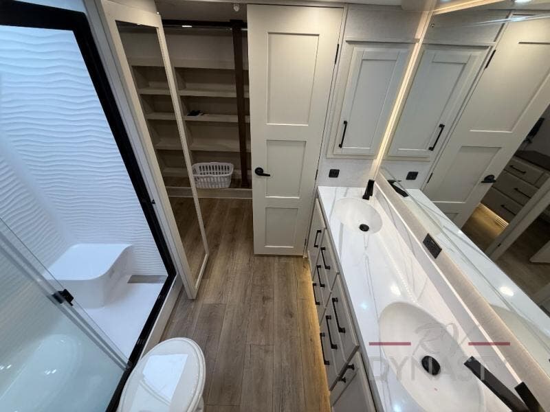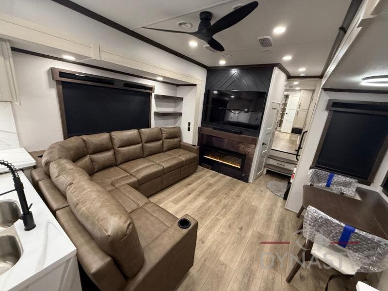The RiverStone 43BFC isn't just another fifth wheel... it's a residential retreat designed for travelers who want every journey to feel like home. This impressive floor has a designated high-end kitchen space with tons of room, a large pantry, ample counter space and a lovely french door refrigerator will make for unforgettable meals on the go. You can also enjoy a great time with your partner and enjoy all the free time you want at the large sectional sofa you'll never want to leave! After enjoying the living room you will be fascinated by the primary bedroom suite that delivers a quiet, comfortable and spacious sanctuary featuring a dresser and dedicated shoe storage to organize all your personal belongings.