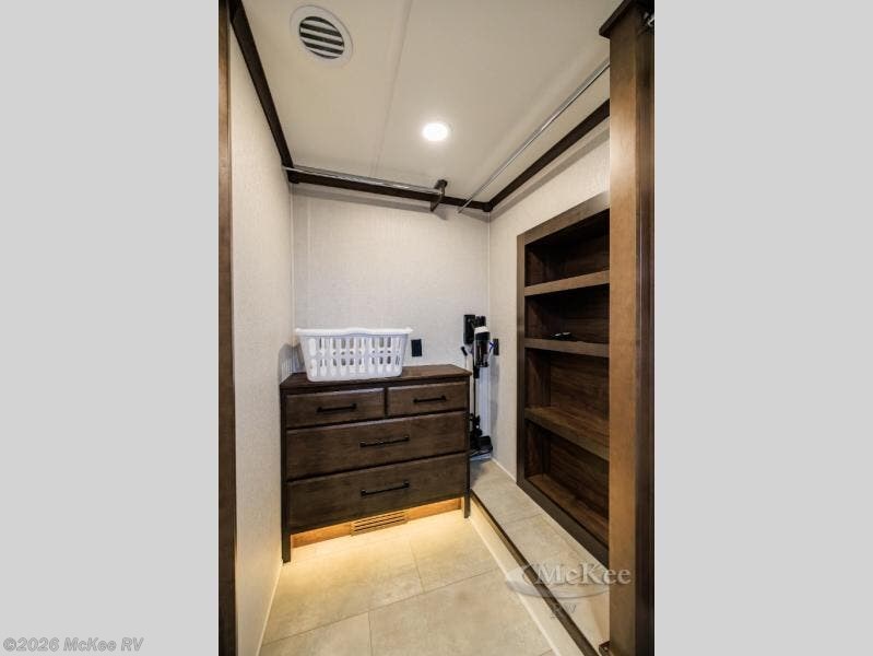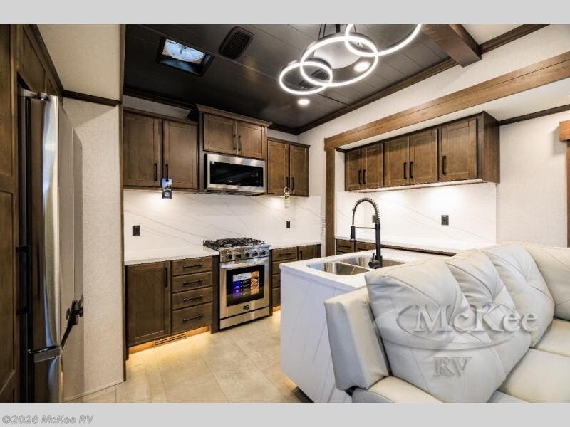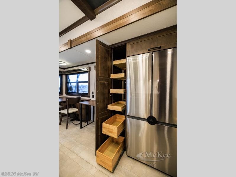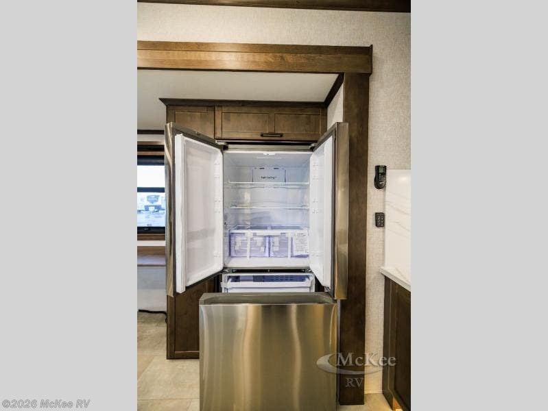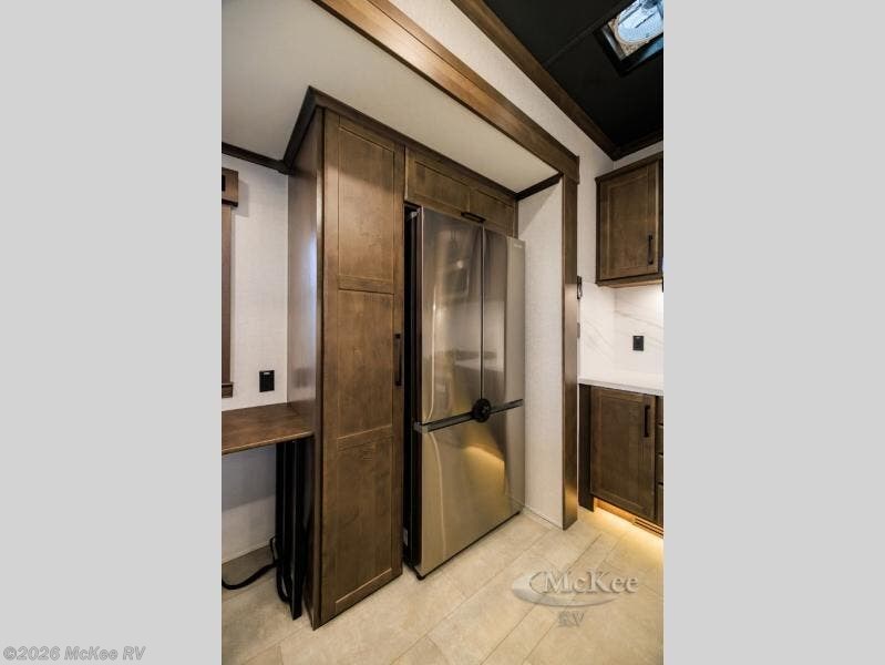 The RiverStone 43BFC isn't just another fifth wheel... it's a residential retreat designed for travelers who want every journey to feel like home. This impressive floor has a designated high-end kitchen space with tons of room, a large pantry, ample counter space and a lovely french door refrigerator will make for unforgettable meals on the go. You can also enjoy a great time with your partner and enjoy all the free time you want at the large sectional sofa you'll never want to leave! After enjoying the living room you will be fascinated by the primary bedroom suite that delivers a quiet, comfortable and spacious sanctuary featuring a dresser and dedicated shoe storage to organize all your personal belongings.
