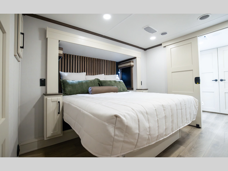 The RiverStone 43BFC isn't just another fifth wheel... it's a residential retreat designed for travelers who want every journey to feel like home. This impressive floor has a designated high-end kitchen space with tons of room, a large pantry, ample counter space and a lovely french door refrigerator will make for unforgettable meals on the go. You can also enjoy a great time with your partner and enjoy all the free time you want at the large sectional sofa you'll never want to leave! After enjoying the living room you will be fascinated by the primary bedroom suite that delivers a quiet, comfortable and spacious sanctuary featuring a dresser and dedicated shoe storage to organize all your personal belongings.