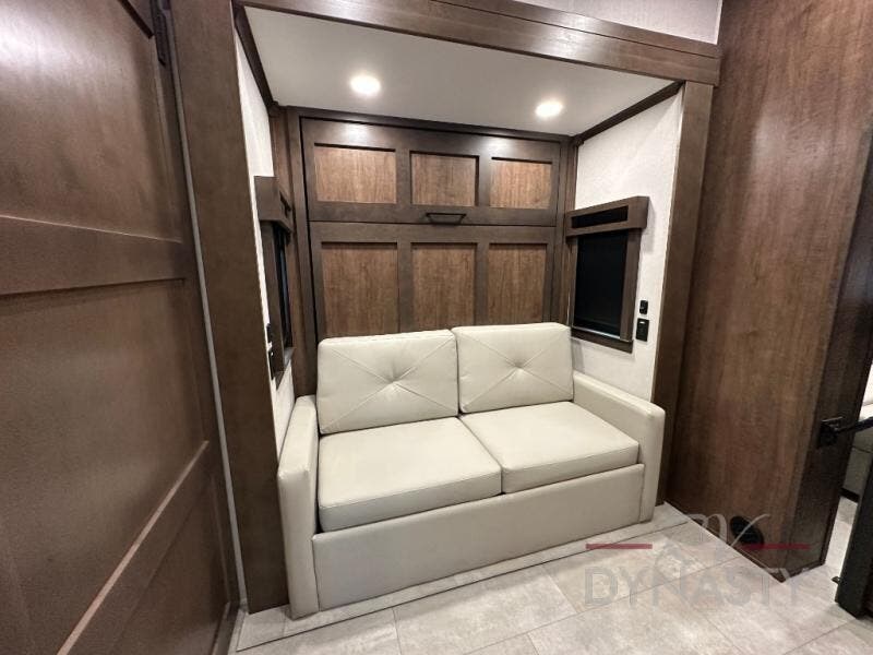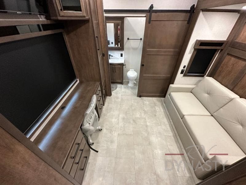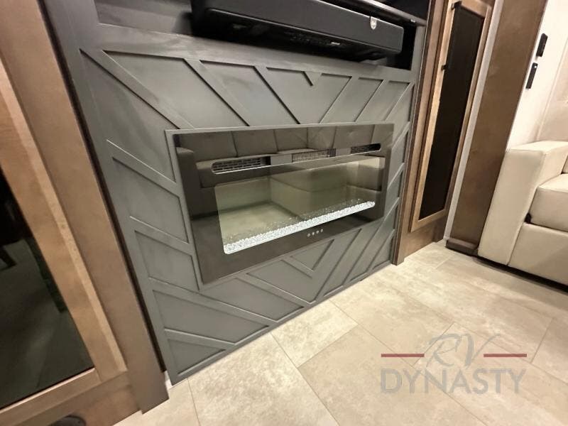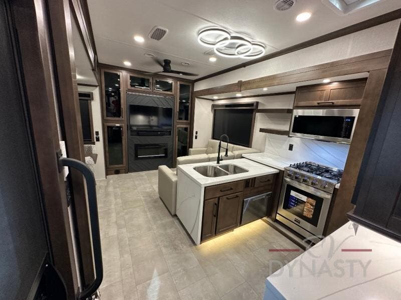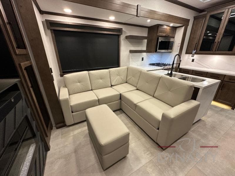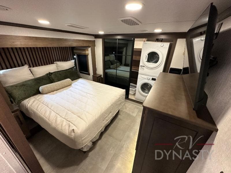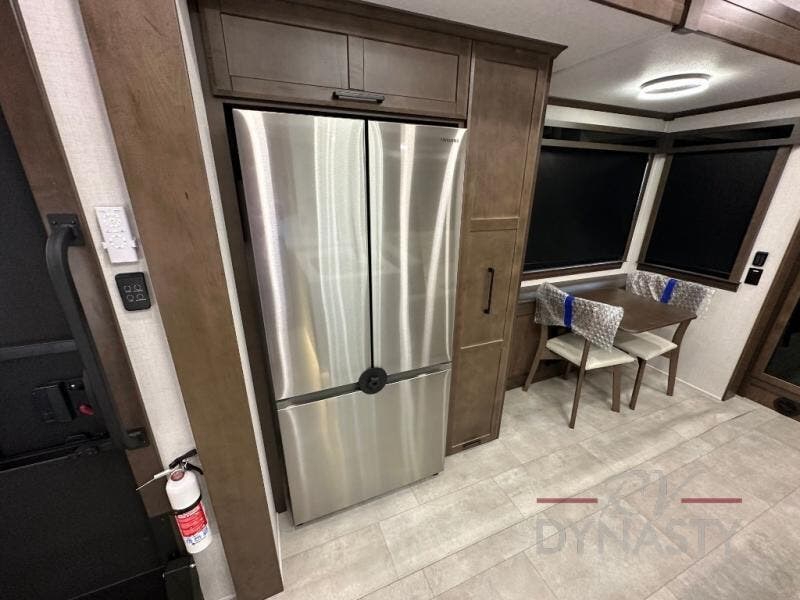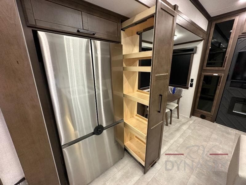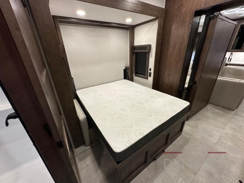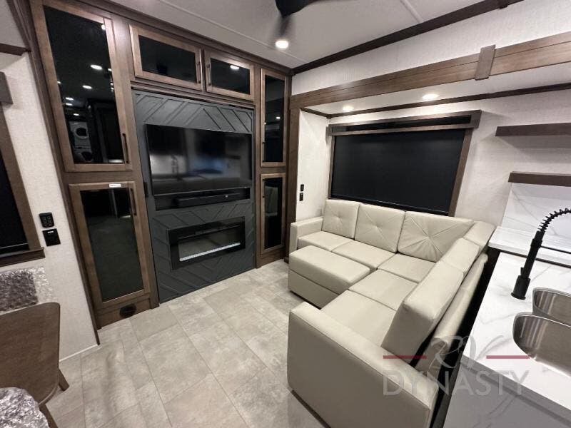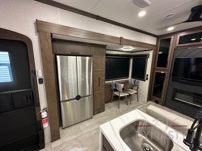 This is the perfect fifth wheel to travel with friends since there are two private bedrooms, one of which is a rear master with a full bath and its own exterior entry door. There is also a Murphy sofa here for your guests to sleep on, along with a wardrobe for their clothes and overhead storage. Head to the front private bedroom where you'll find a king bed slide, a dresser and a bench, a front wardrobe, plus a washer and dryer to make life at the campground easier than ever. The middle of this unit features the kitchen and living area. There is plenty of counter space plus a hutch and pantry for added storage. A sectional sofa provides tons of comfort, especially since its in perfect view of the fireplace and swinging entertainment center. There is also a dinette with four chairs where you can dine together and play a game of cards in the evening!