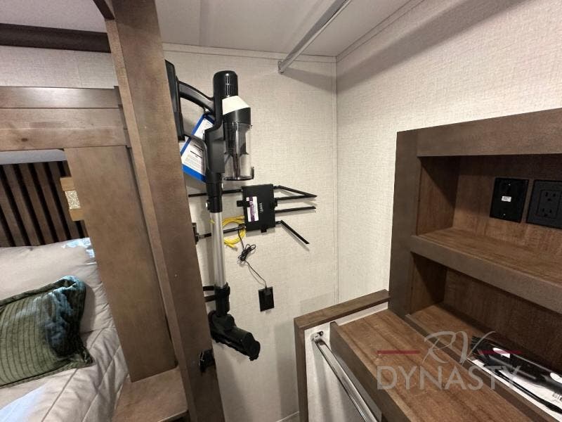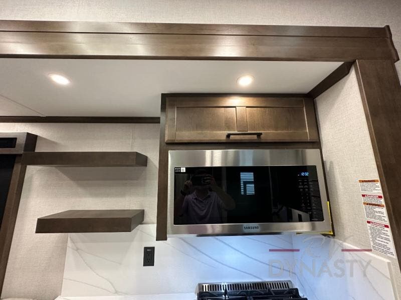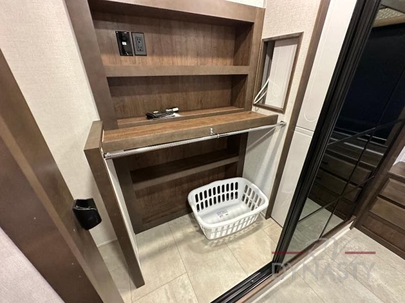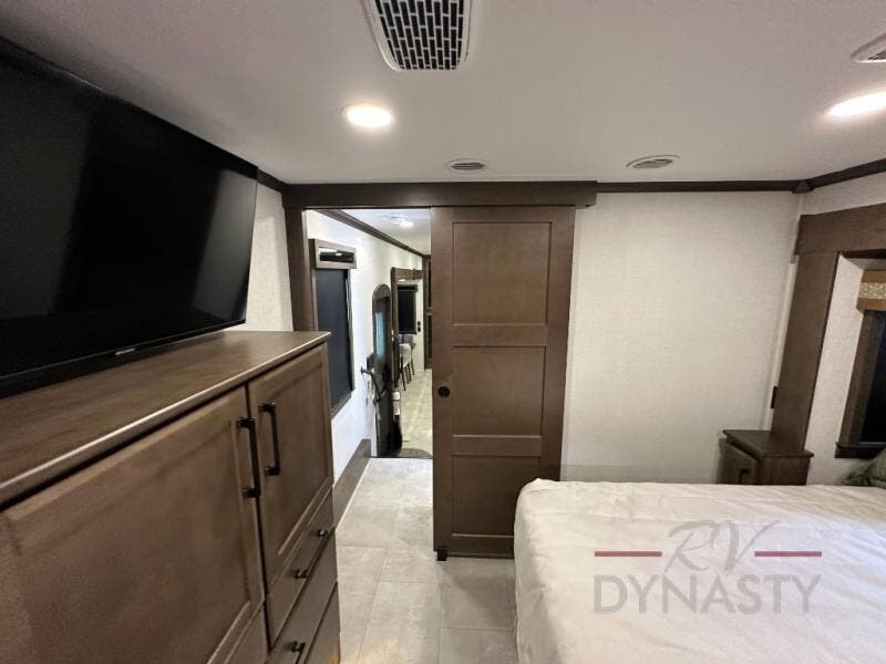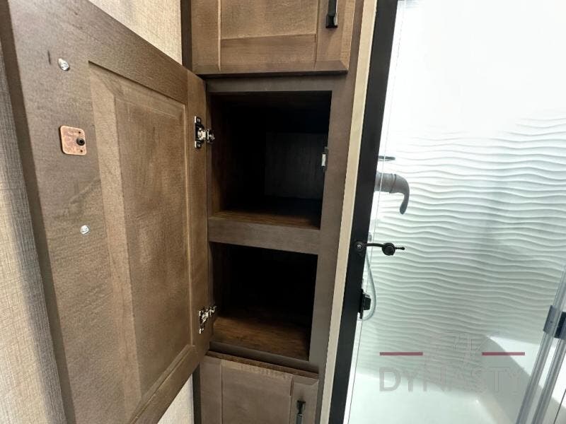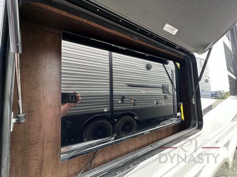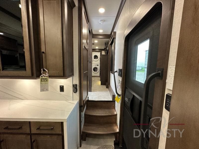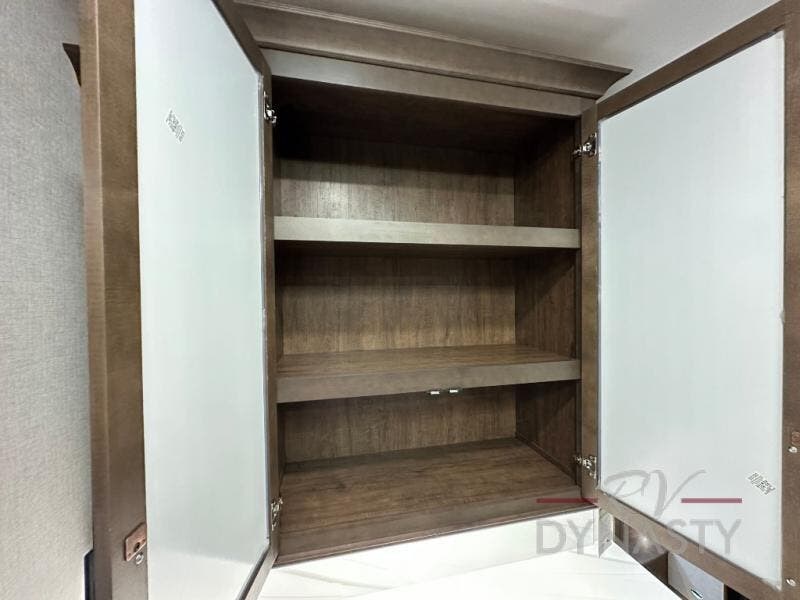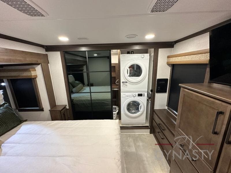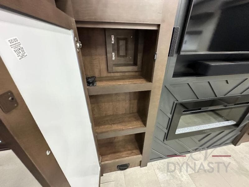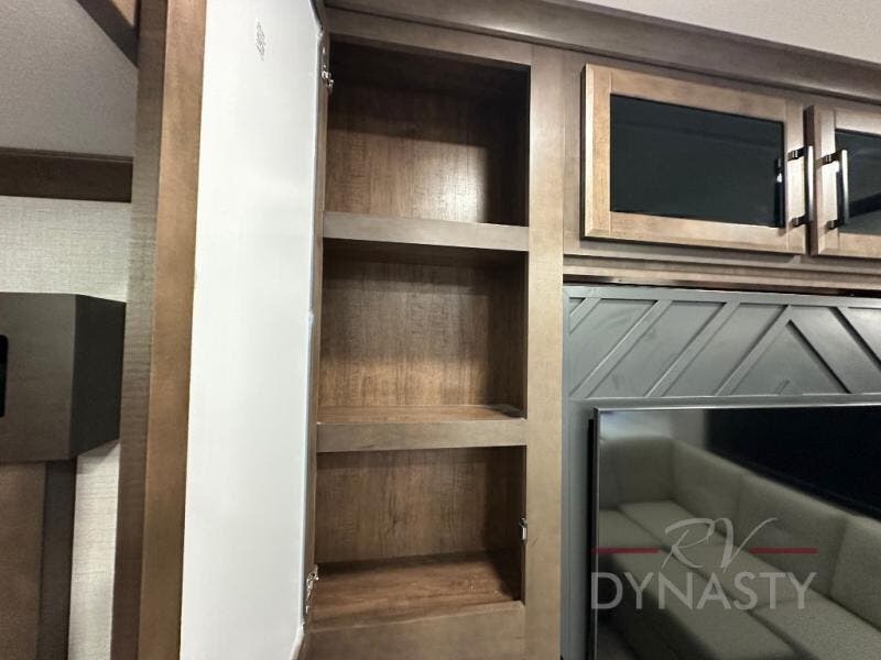 This is the perfect fifth wheel to travel with friends since there are two private bedrooms, one of which is a rear master with a full bath and its own exterior entry door. There is also a Murphy sofa here for your guests to sleep on, along with a wardrobe for their clothes and overhead storage. Head to the front private bedroom where you'll find a king bed slide, a dresser and a bench, a front wardrobe, plus a washer and dryer to make life at the campground easier than ever. The middle of this unit features the kitchen and living area. There is plenty of counter space plus a hutch and pantry for added storage. A sectional sofa provides tons of comfort, especially since its in perfect view of the fireplace and swinging entertainment center. There is also a dinette with four chairs where you can dine together and play a game of cards in the evening!