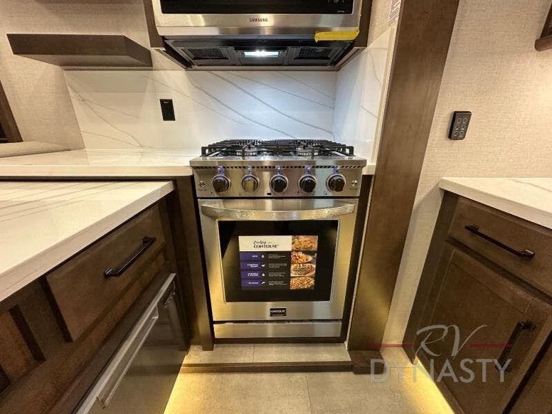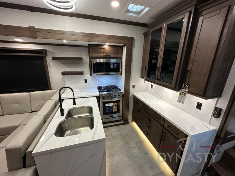 The Forest River RiverStone fifth wheels and toy haulers are luxurious units that have it all! You'll find an automatic six-point hydraulic level-up system to keep your unit in place, and there is preparation for a four-camera observation system. The TravlFi Journey XTR 4G/LTE router and WiFi extender will help you stay connected to the outside world, and you'll never have to overpack again since the Splendid “Astral” stackable washer and dryer will let you clean the small amount of clothes you've brought with you. Another high luxury is the Fischer Paykal dishwasher which will allow you to spend more time enjoying your camp life and less time cleaning up. Each unit is built with an LCI Road Armour suspension system, dual-pane frameless windows, a full docking station, a 200W solar panel, and a BMPro touch control system.