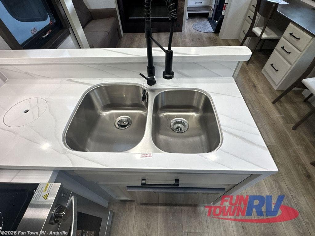 Show your family a good time with this RiverStone fifth wheel! You will get to stay in a super comfortable master suite at the front of this unit which has a dual-sink vanity in the full bathroom. The bedroom offers you a king-size bed that you can rest on while you watch the 40" LED TV across from you, and there is a half bathroom just outside the bedroom for your friends or family to use. If you've decided to bring work with you on the road, you'll be grateful to find a desk in the living area, and the pull-out dinette is a great place to sit down for meals. Work your magic in the kitchen and prepare something delicious on the four-burner range for everyone to eat.
