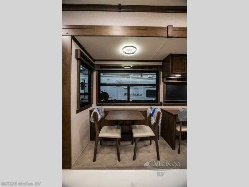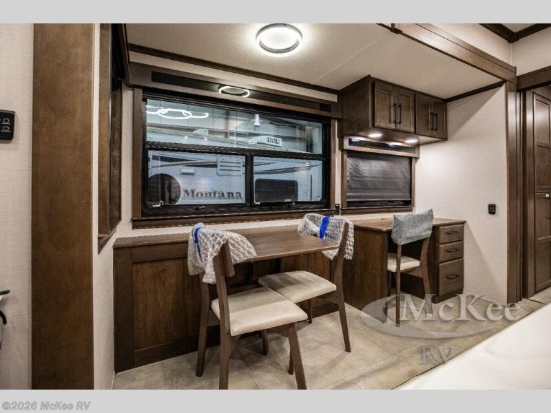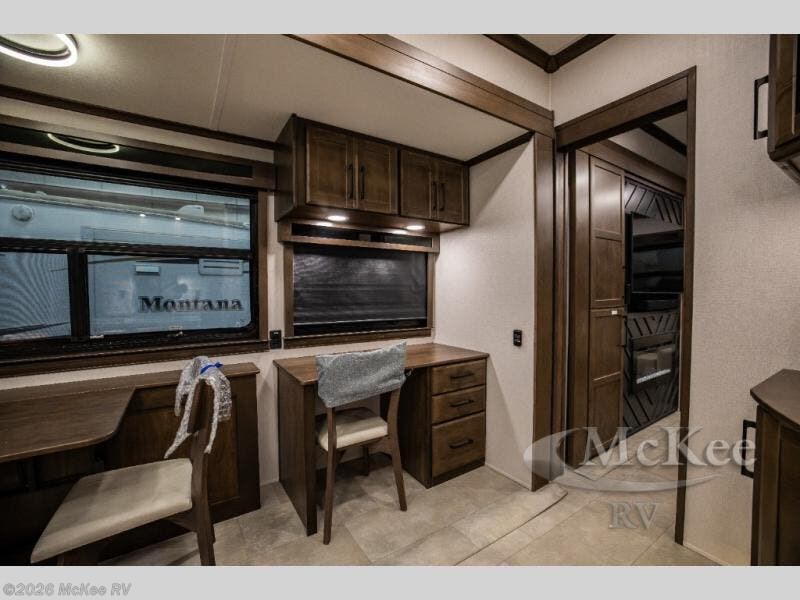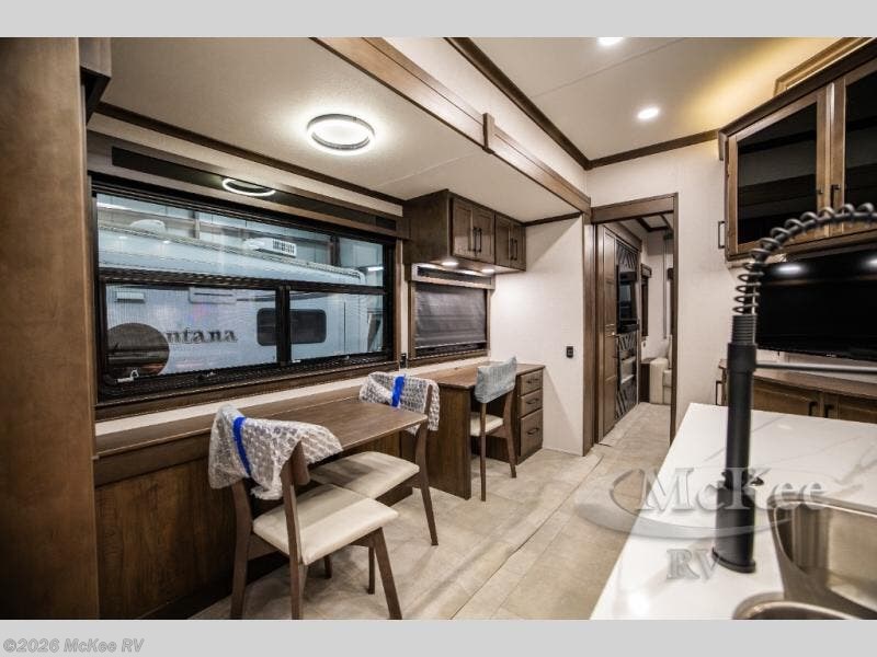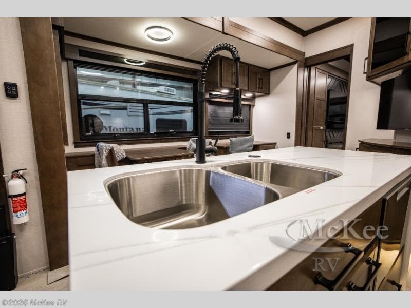 This RiverStone fifth wheel has an amazing den in the back! This area is not only an excellent lounging space with its theater sofa, hide-a-bed sofa, and entertainment center, but it is also a comfortable guest suite because it contains its own half bathroom and a drop-down queen bed. Each section of this unit has opposing slides, so you'll have plenty of living space, and the kitchen area has a pull-out dinette so that you can sit down with hot meals each night. You have a large pantry for snacks and an 18-cubic foot French door refrigerator with ice maker for cold beverages. The ceiling fan allows you to cool off the interior without overworking the AC, and the cordless vacuum will help you clean up messes.