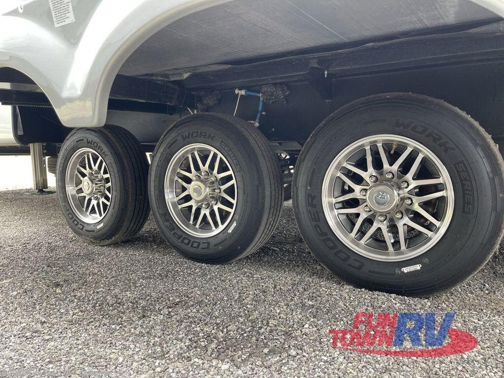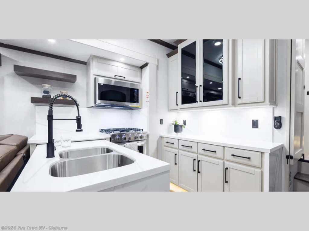The Forest River RiverStone fifth wheels and toy haulers are luxurious units that have it all! You'll find an automatic six-point hydraulic level-up system to keep your unit in place, and there is preparation for a four-camera observation system. The TravlFi Journey XTR 4G/LTE router and WiFi extender will help you stay connected to the outside world, and you'll never have to overpack again since the Splendid “Astral” stackable washer and dryer will let you clean the small amount of clothes you've brought with you. Another high luxury is the Fischer Paykal dishwasher which will allow you to spend more time enjoying your camp life and less time cleaning up. Each unit is built with an LCI Road Armour suspension system, dual-pane frameless windows, a full docking station, a 200W solar panel, and a BMPro touch control system.