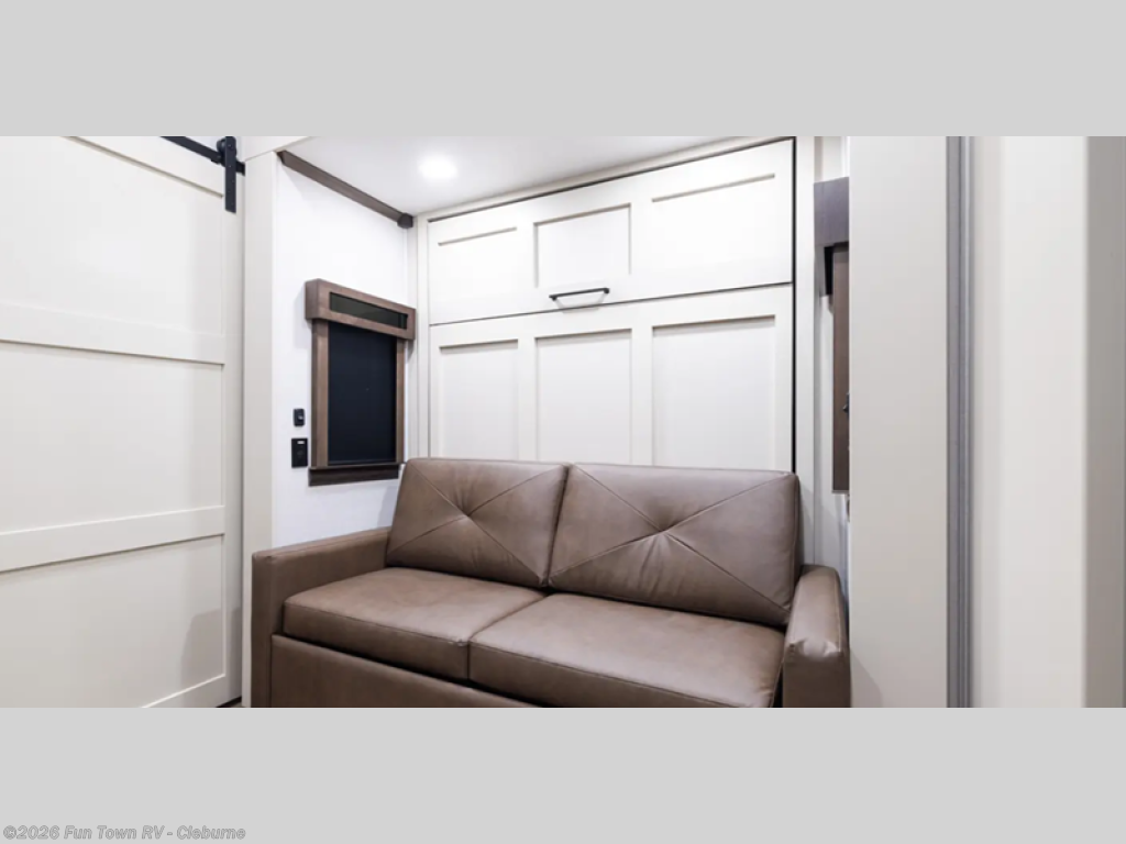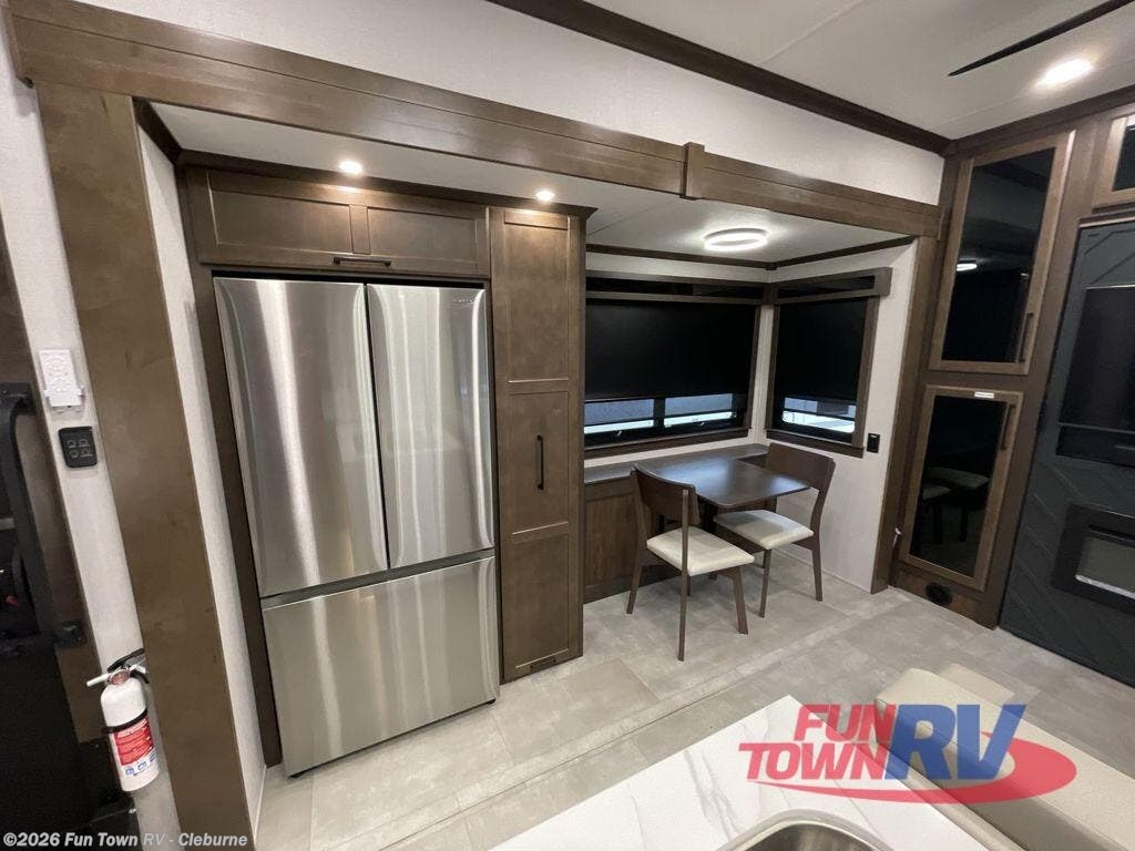 This is the perfect fifth wheel to travel with friends since there are two private bedrooms, one of which is a rear master with a full bath. There is also a Murphy sofa here for your guests to sleep on, along with a wardrobe for their clothes and overhead storage. Head to the front private bedroom where you'll find a king bed slide, a dresser and a bench, a front wardrobe, plus a washer and dryer to make life at the campground easier than ever. The middle of this unit features the kitchen and living area. There is plenty of counter space plus a hutch and pantry for added storage. A sectional sofa provides tons of comfort, especially since its in perfect view of the fireplace and swinging entertainment center. There is also a dinette where you can dine together and play a game of cards in the evening!
