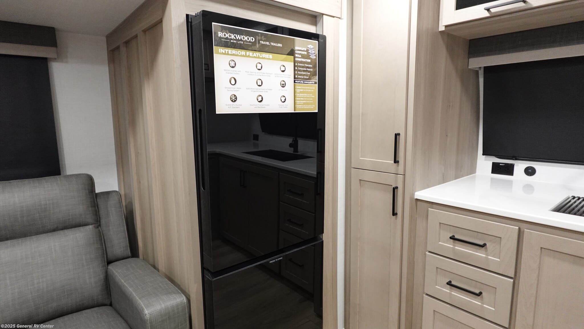 Forest River Rockwood Mini Lite travel trailer 2523MBR highlights: 12V TV Rear Bathroom Solid Step Entry Steps Kitchen Pantry This travel trailer is the best option for you and your partner! The lavish full rear bathroom features a spacious layout and a convenient linen closet, perfect for relaxation and refreshment. The elegant bedroom boasts a plush queen bed, ample wardrobe space, and stylish dresser, creating a serene retreat. The spacious living room and kitchen combined area is the heart of the trailer, featuring plush theater seating for cozy movie nights, a generous closet for storing essentials, and a 12V Smart TV for entertainment on the go. Plus, the expansive countertop with chairs provides a perfect spot for gourmet meals or socializing, while the premium three-burner cooktop, well-stocked kitchen pantry, and high-performance microwave make meal prep and cooking a true delight. Each Rockwood Mini Lite travel trailer by Forest River is constructed with a fully laminated one-piece walkable roof, sleek frameless windows, and a six-sided full aluminum frame for strength and durability. The 12V thermostatically controlled heated tanks, plus radiant foil in the underbelly will allow you to camp well into the colder months, and the 200W roof solar panel will be perfect for a little off-gridding. Each model includes solid surface kitchen countertops, hidden hinge cabinet doors, roller shades, plus many more interior features. Having an AIR 360+ omnidirectional antenna with WiFi prep on board gives you the option to get some work done if it's needed, and the power tongue jack provides hassle-free set up, so you can enjoy more time relaxing!