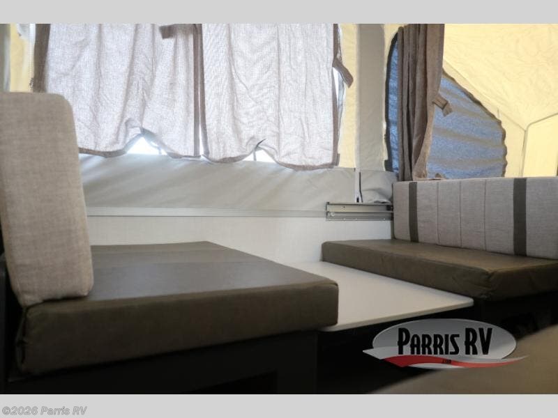 This Rockwood Freedom Series folding pop-up camper is going to let you camp in freedom! You will be able to use the outdoor griddle to cook up some delicious food, and the 9' awning with an LED light will keep you protected while you work. You will also find that the booth dinette will be useful for both meal time and bed time when the two tent end beds aren't enough space, and the storage lid under the front bed provides storage for luggage, blankets, and more!