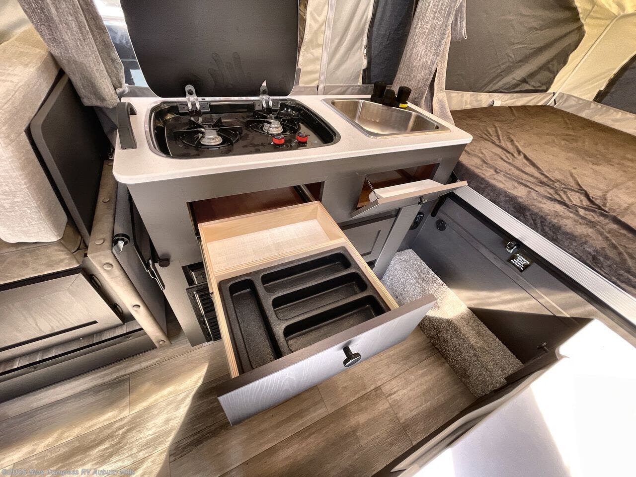 Front swing-out galley with two-burner stovetop, stainless steel sink, and 12V refrigerator