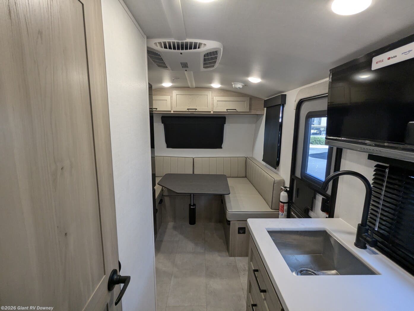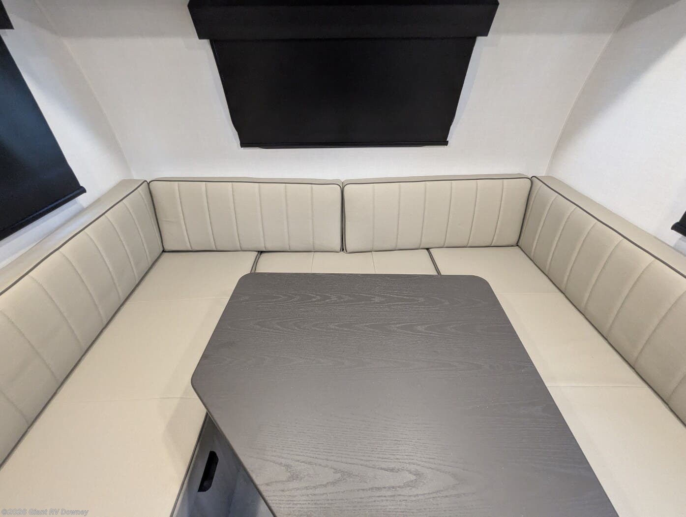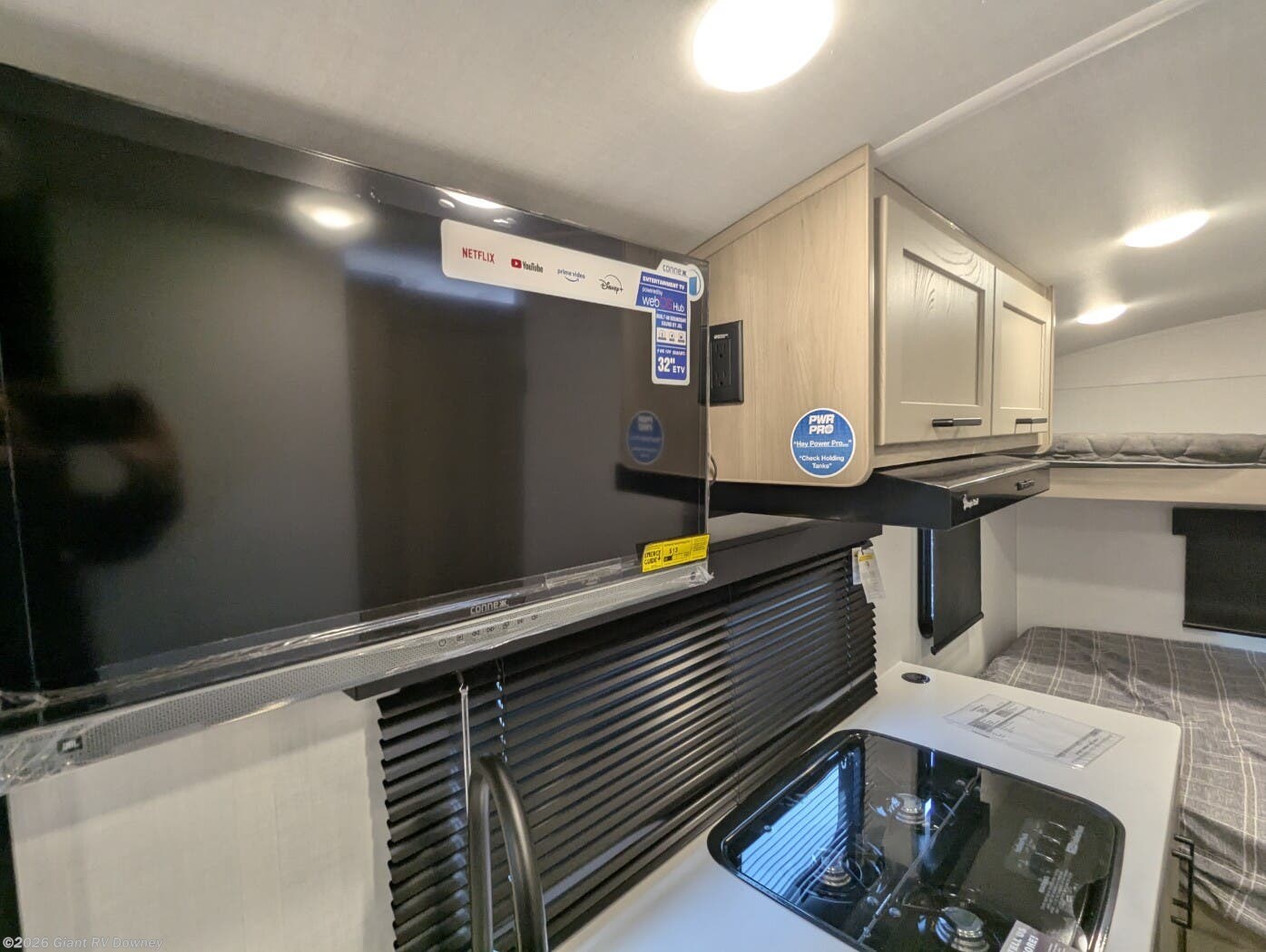 - Modern Amenities: Features air conditioning, a kitchen with a 12V refrigerator, gas oven, exterior griddle, and a 32” 12V TV for entertainment.