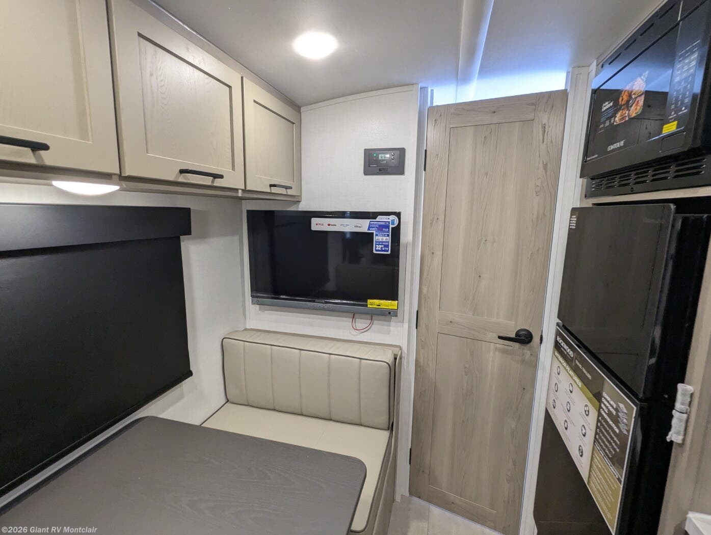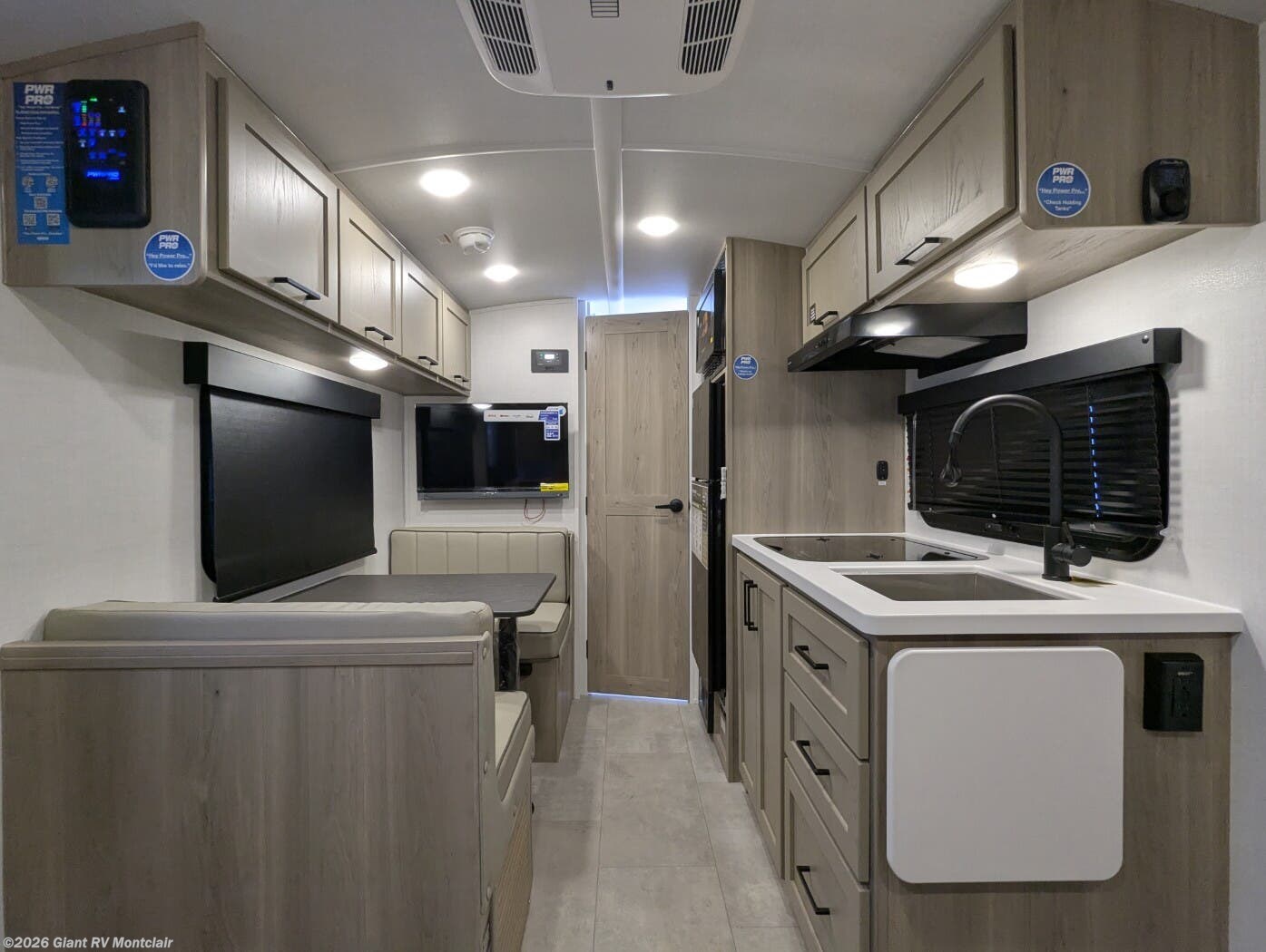 - Modern Kitchen: Center kitchen with a 12V refrigerator, 2-burner cooktop, convection microwave, and vinyl flooring for meal prep.