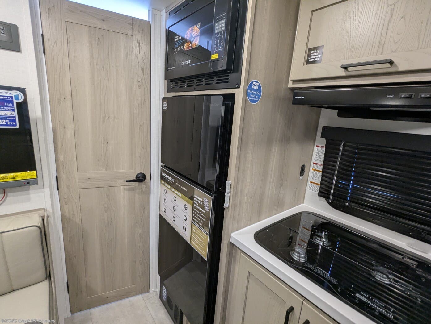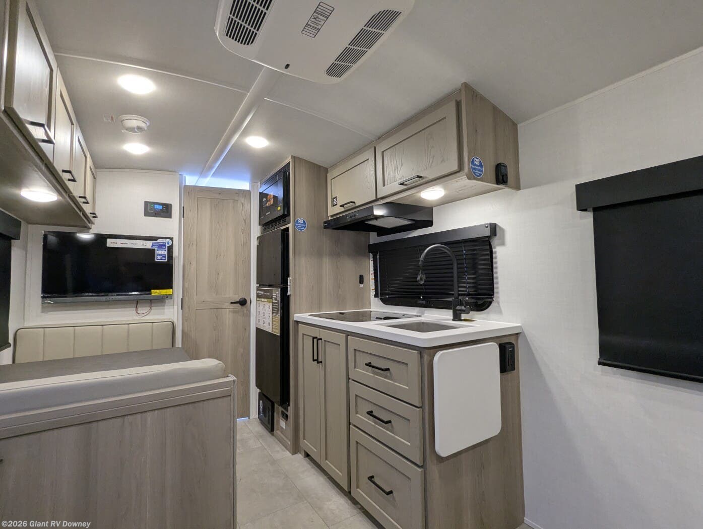 - Modern Kitchen: Center kitchen with a 12V refrigerator, 2-burner cooktop, convection microwave, and vinyl flooring for meal prep.