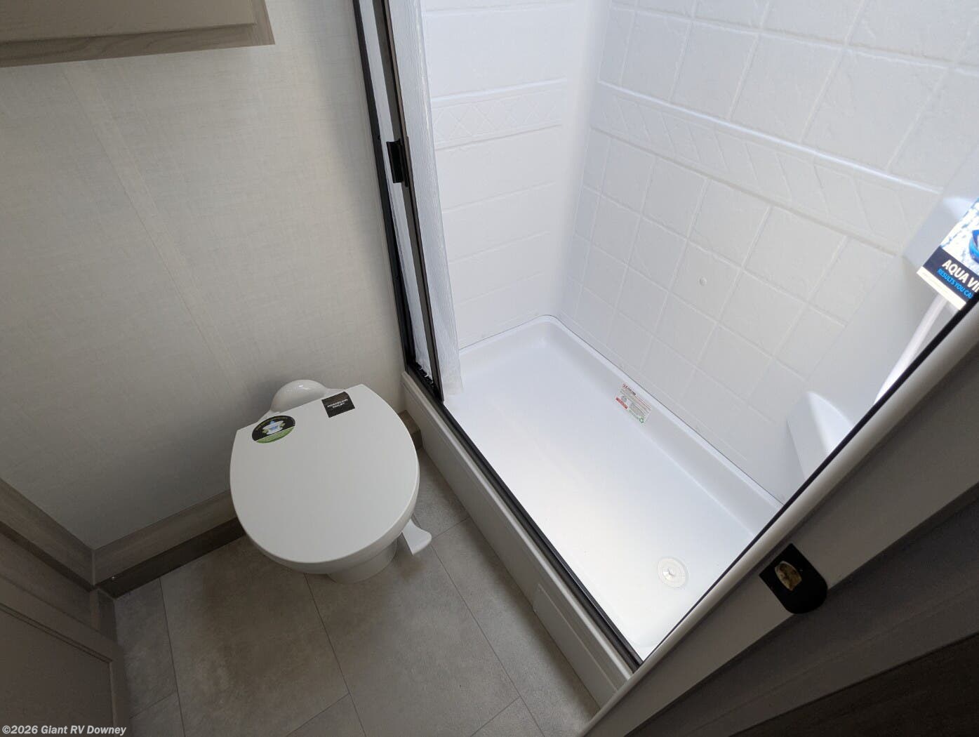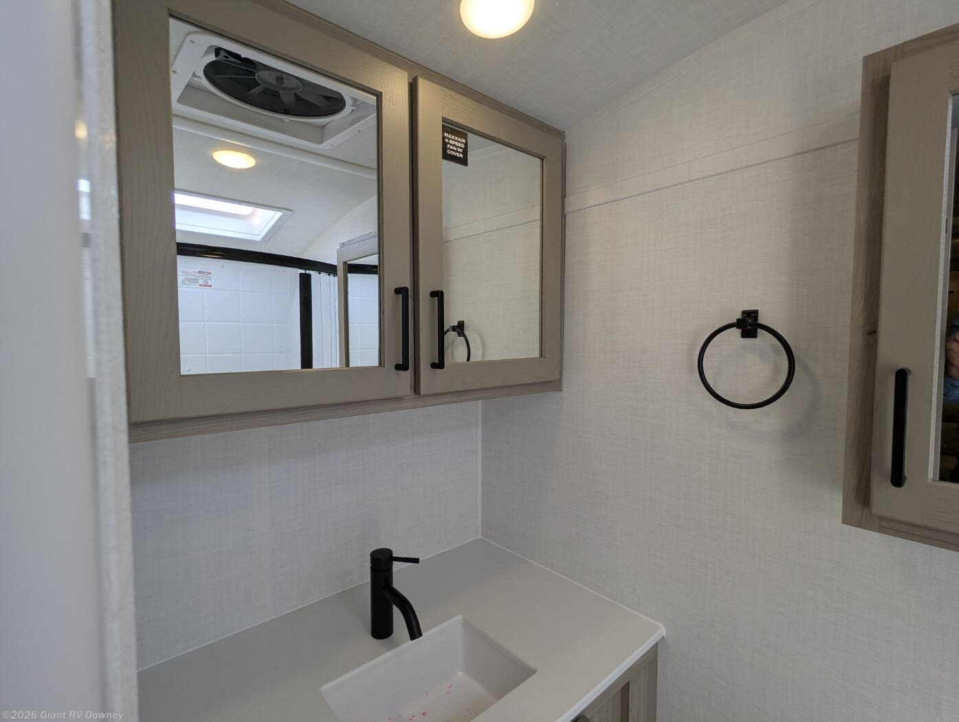 - Full Rear Bath: Spacious bathroom with a 24" x 36" shower, porcelain toilet, and Maxxair fan for comfort.