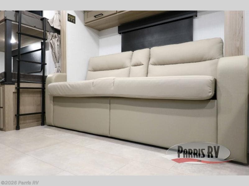 Perfect for families, couples, or friends, this trailer offers a great balance of comfort and practicality! Sleeping spots can be found in the bunk beds, which provide a cozy sleeping spot for kids or guests, while the 54” x 74” Murphy bed offers a spacious and comfortable sleeping area for two. Moreover, the kitchen is equipped with a three-burner cooktop for gourmet meals, a convection microwave for quick and easy cooking, and a fridge. The 39” dinette provides a comfortable spot for meals and snacks, perfect for enjoying quality time with family and friends. The 30" x 15" table provides additional space for dining, working, or playing games, and the sofa provides a comfortable seating area for relaxation and socializing, plus, the full bathroom provides a convenient spot to freshen up after a long day of exploring.
