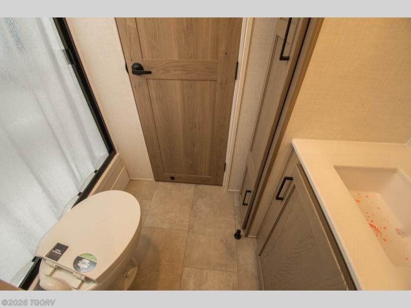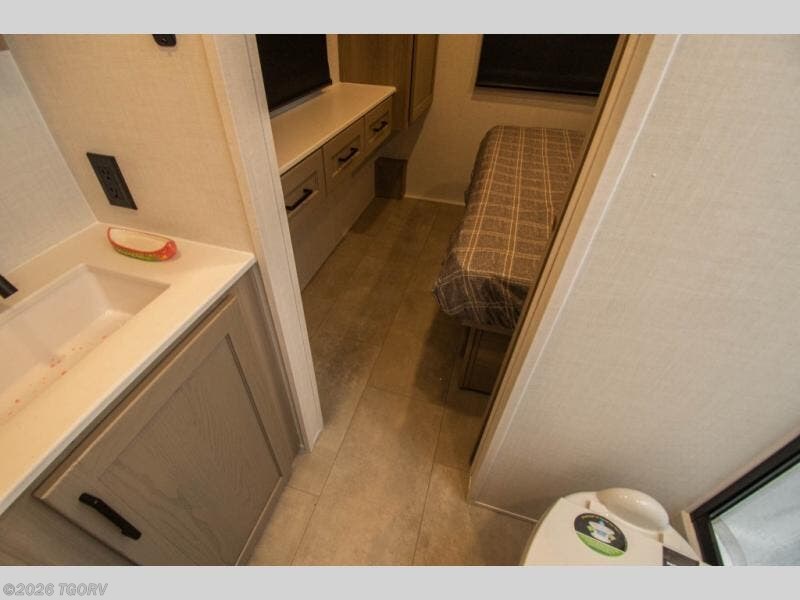 Starting at the rear, this trailer offers a spacious bedroom featuring a 60" x 74" queen bed housed in a slide-out, giving you both room to stretch out and added comfort. Across from the bed, a wardrobe provides ample storage for clothing, while a built-in desk with a TV makes it easy to catch up on work or unwind on the road. Moving toward the center, the full bathroom offers convenience with a proper shower and toilet on one side, paired with a sink and a large linen closet perfect for storing towels and toiletries. At the front, the compact but capable kitchen includes a refrigerator, sink, and microwave everything you need to prepare a satisfying meal. Rounding out the space, a cozy corner dinette gives you a comfortable place to enjoy meals or play board games after a long day of adventure.