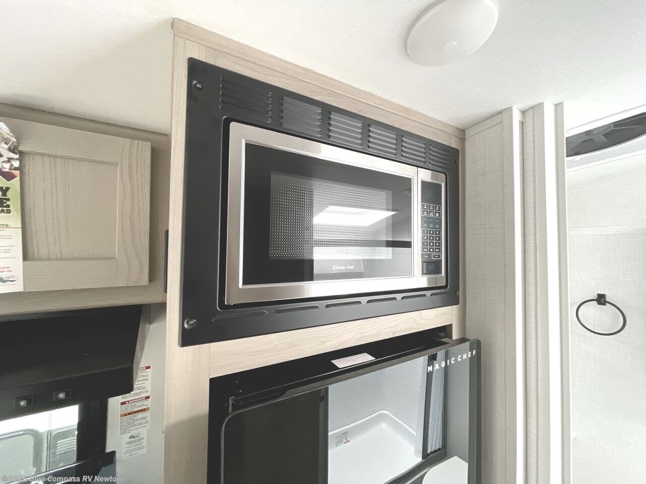 This travel trailer will feel more like home with its front bedroom and walk-around full-size bed. You'll enjoy the 12V TV as you relax on the 72" sofa with a table and cupholders. The full rear bath includes a spacious shower to clean up in each day and there is a linen closet for clean towels. When you're ready to prepare dinner you'll have a three burner cooktop and microwave oven indoors! And don't forget the exterior storage allows you to bring along beach toys and tackle boxes. The optional Power Package available on this model includes three 200W solar panels, a side solar plug-in, a 3kW 160A inverter, and more off-grid features!