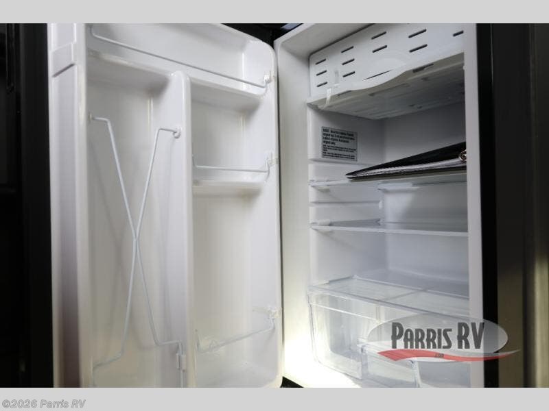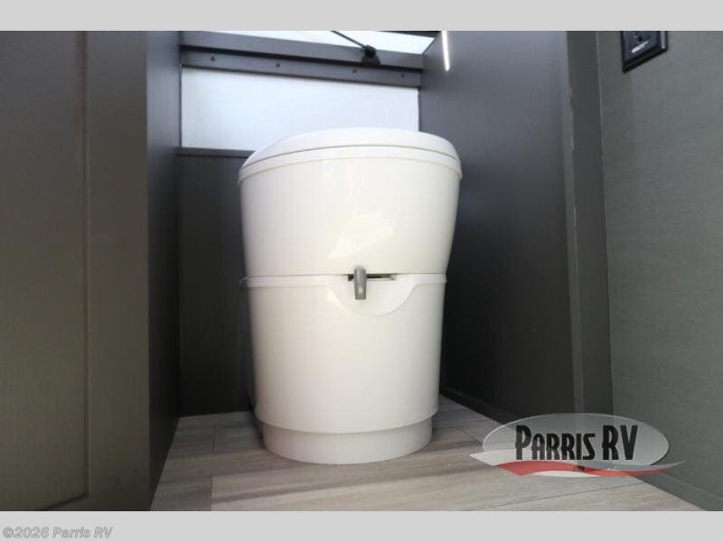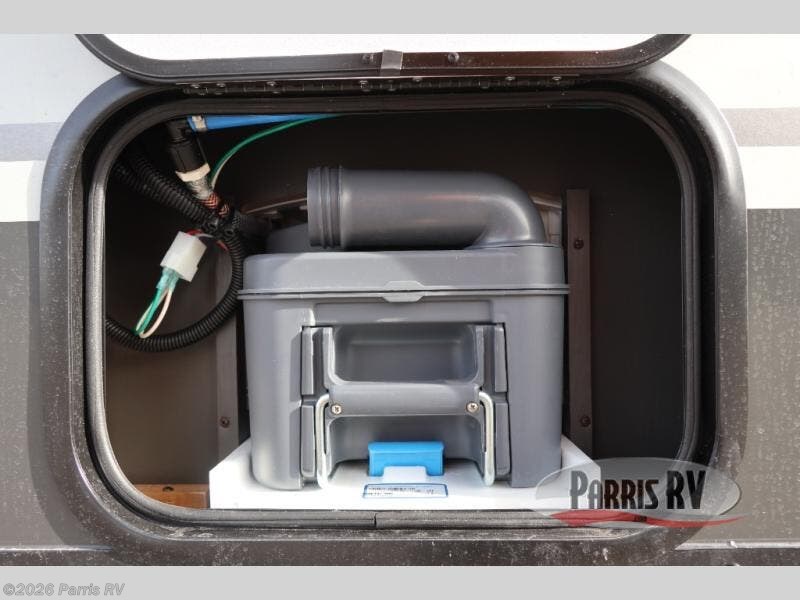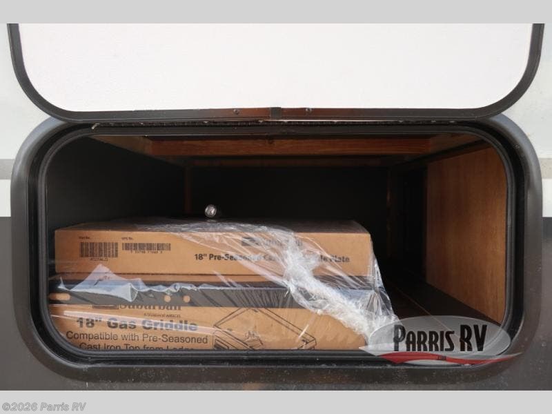 The gaucho bed is a comfy retreat, perfect for lounging or snoozing. The table transforms into a workspace or dining area, making it a great spot for meals or games. Beat the heat with the under-bunk air conditioner, keeping you chill even on the warmest days. The toilet is a welcome convenience, and the dormer adds a touch of extra headroom and natural light. The fridge keeps your snacks and drinks fresh, while the bunk bed provides additional sleeping space for kids or friends. And in the exterior, the pass-thru storage is perfect for stashing your outdoor gear, toys, and essentials, so you can bring everything you need for a blast.