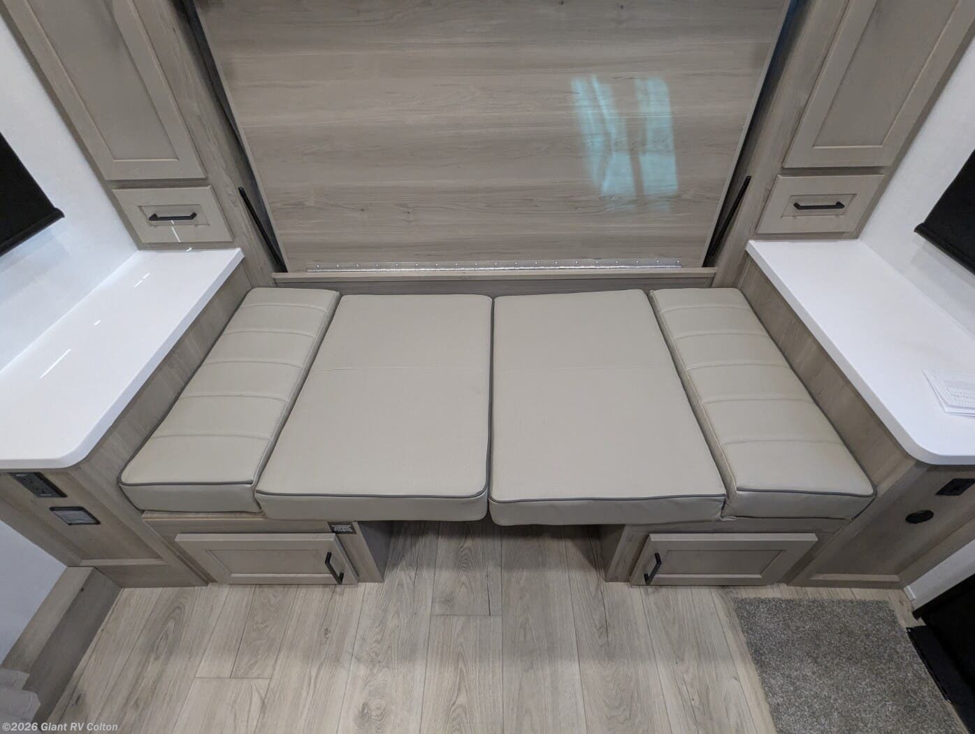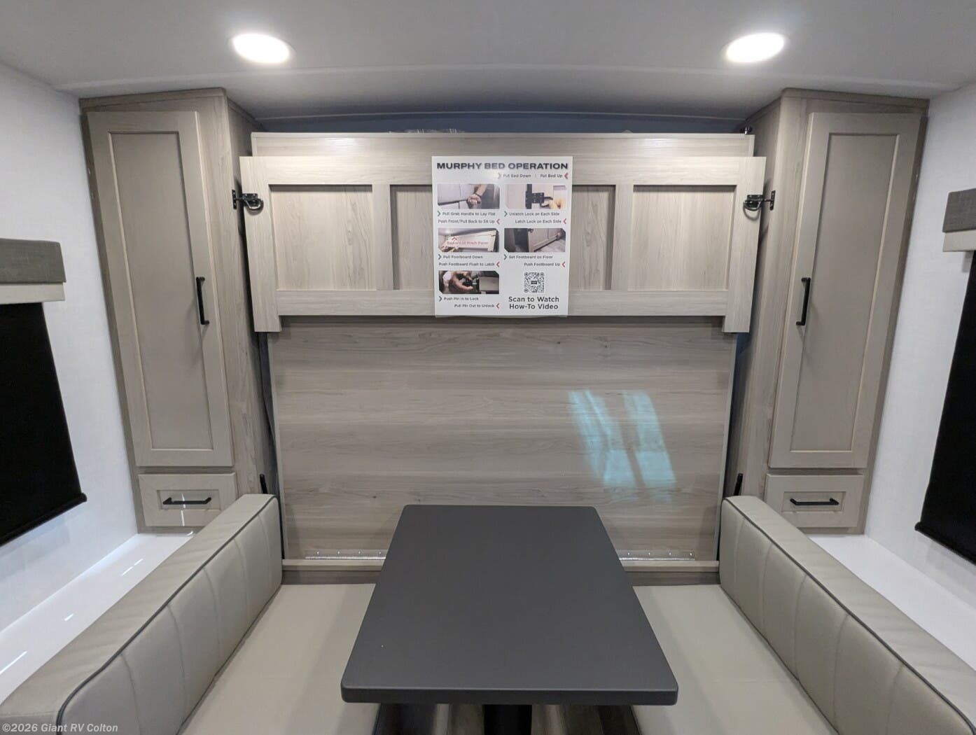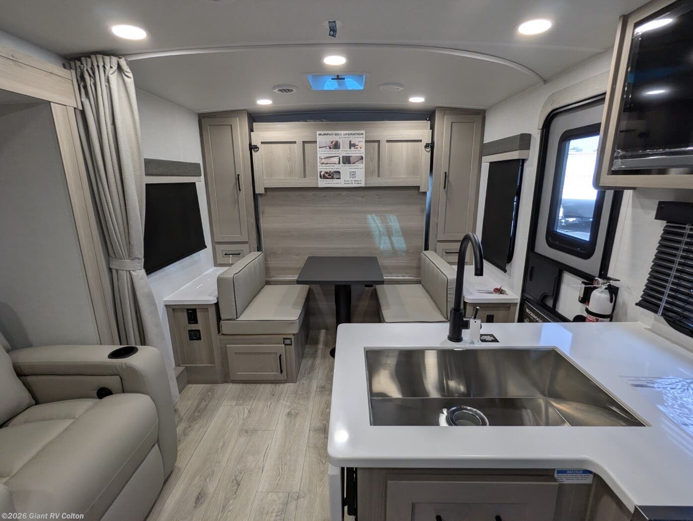 • Murphy Bed + Theater Seating Layout with a front Murphy bed that converts to a dinette, plus 72" theater seating — maximizing daytime living space and nighttime comfort