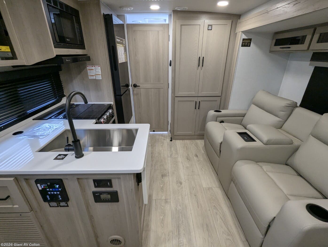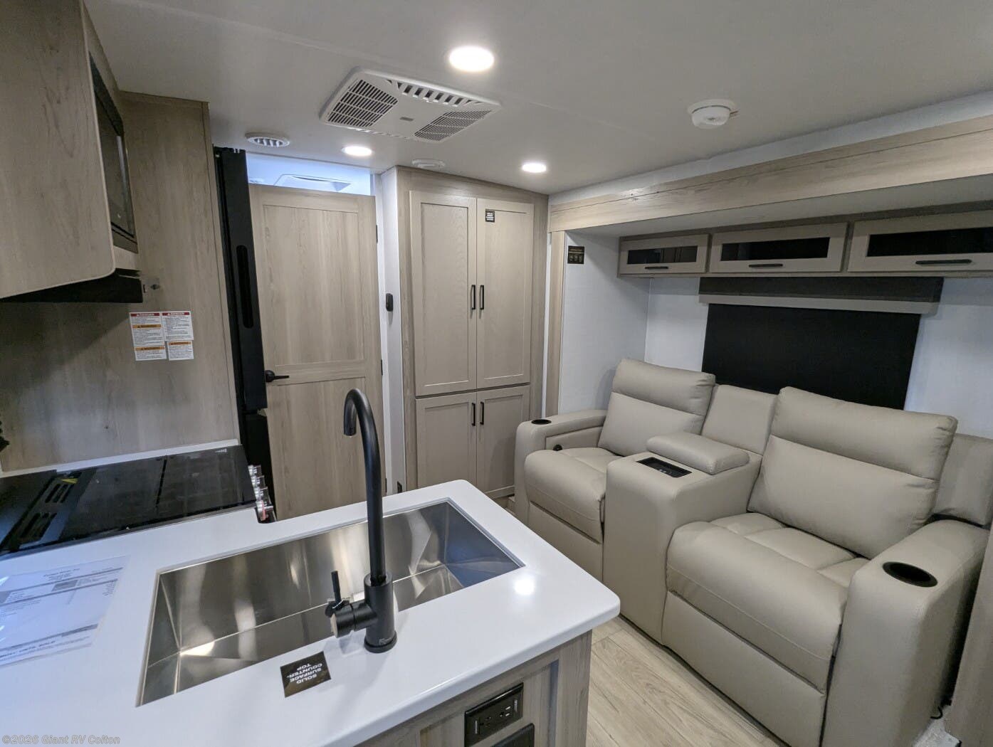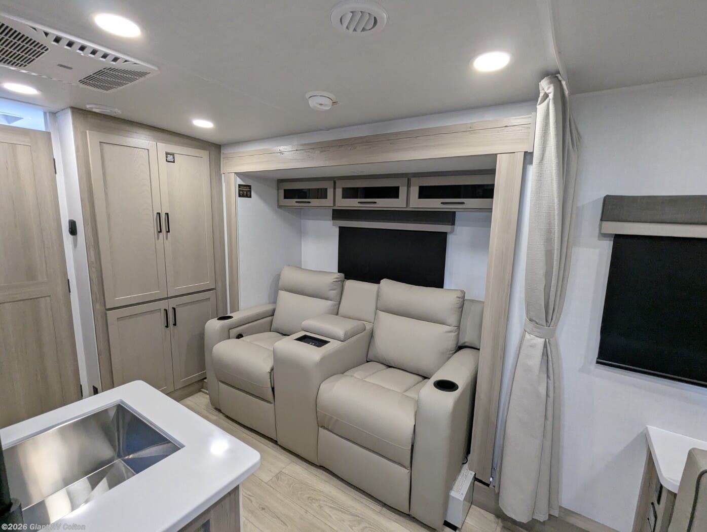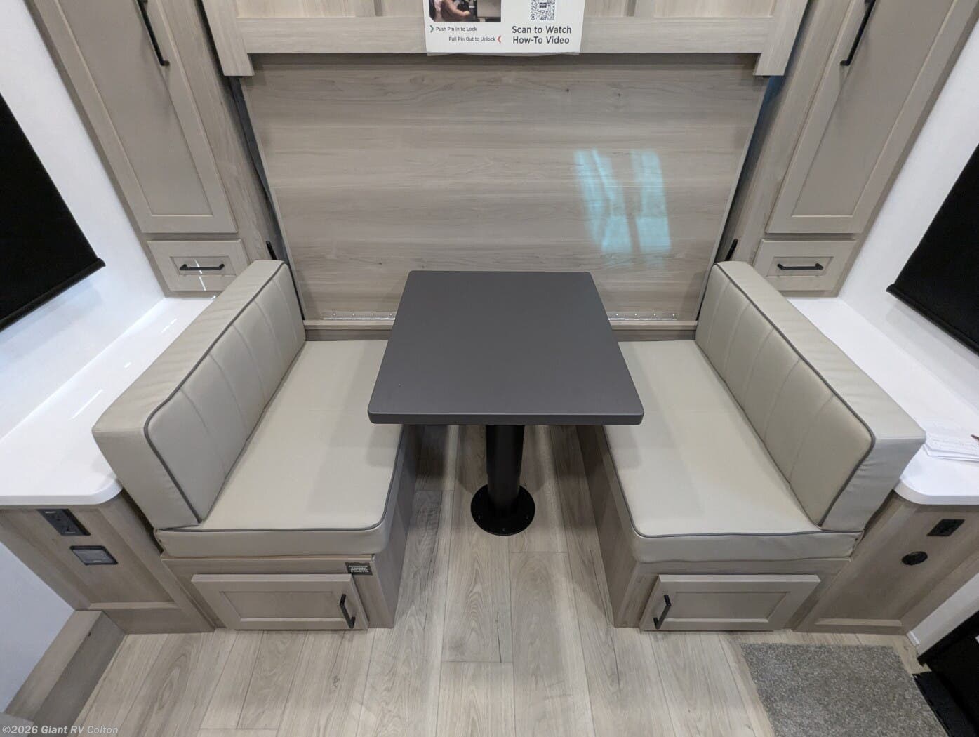 • Murphy Bed + Theater Seating Layout with a front Murphy bed that converts to a dinette, plus 72" theater seating — maximizing daytime living space and nighttime comfort