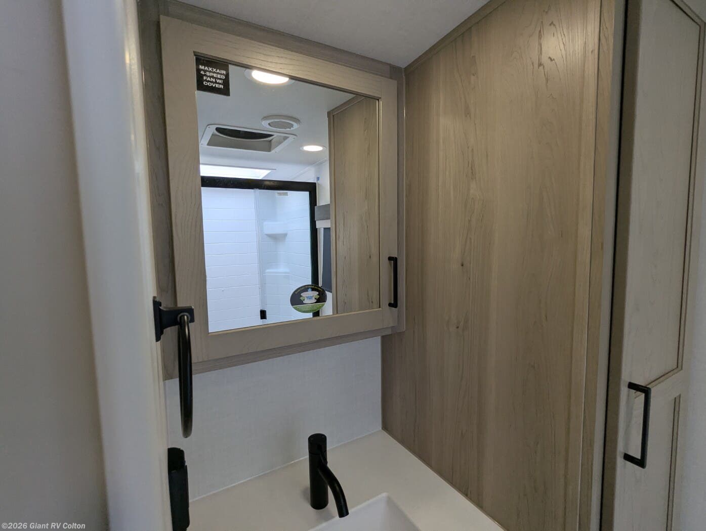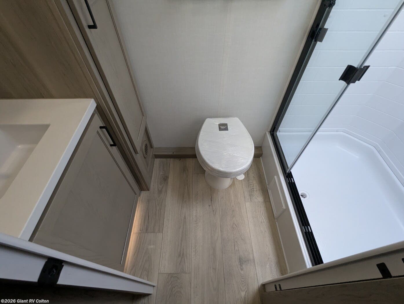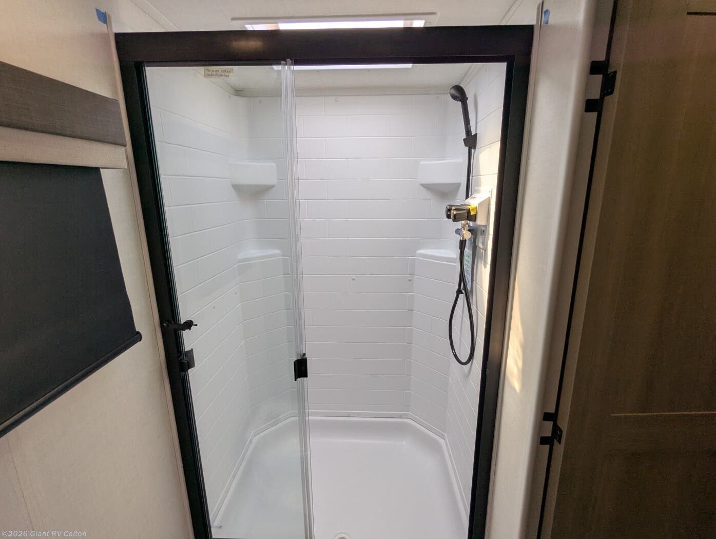 • Spacious Rear Bathroom featuring a large shower, vanity, and linen storage — offering residential comfort in a compact 22’ trailer