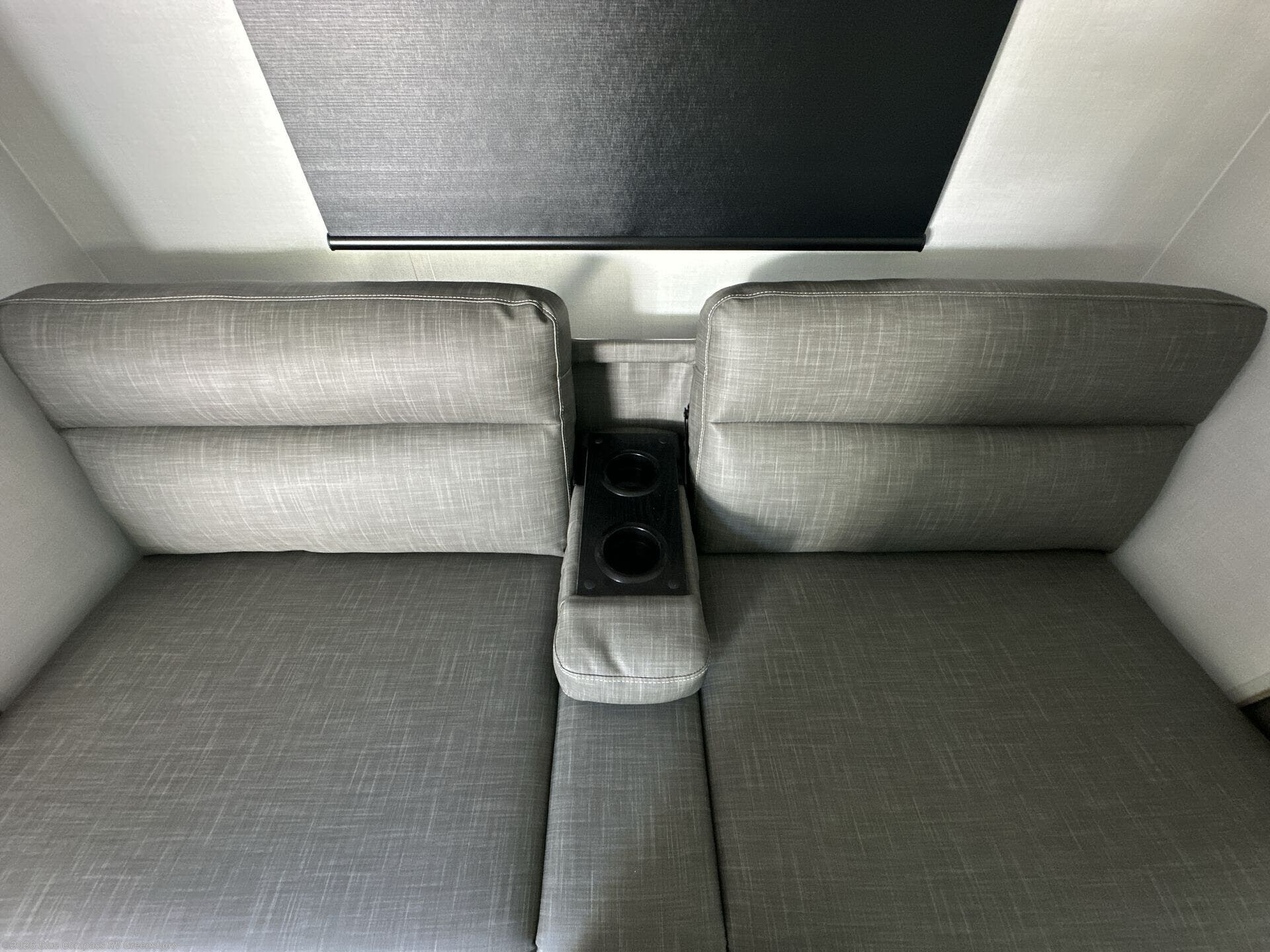 Wherever you decide to camp, you will love every minute in this cute couple's trailer. The sofa slide with a table will provide a place to relax, eat, and even sleep an extra guest if you have one, and the front RV queen bed includes a privacy curtain to enjoy your own space. There are dual bedroom wardrobes to keep your clothes tidy, and you'll find two pass-through storage compartments for your larger gear. An outside griddle with an LP hookup will allow you to make breakfast outdoors, and there is a three burner cooktop indoors if the weather isn't cooperating. Since there is a full bath on board you won't have to use the camp's facilities, and you can make it a movie night with the 32" TV in the main living area!