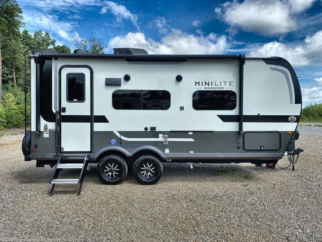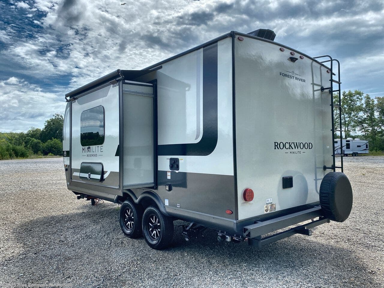 Each Rockwood Mini Lite travel trailer by Forest River is constructed with a fully laminated one-piece walkable roof, sleek frameless windows, and a six-sided full aluminum frame for strength and durability. The 12V thermostatically controlled heated tanks, plus radiant foil in the underbelly will allow you to camp well into the colder months, and the 200W roof solar panel will be perfect for a little off-gridding. Each model includes solid surface kitchen countertops, hidden hinge cabinet doors, roller shades, plus many more interior features. Having an AIR 360+ omnidirectional antenna with WiFi prep on board gives you the option to get some work done if it's needed, and the power tongue jack provides hassle-free set up, so you can enjoy more time relaxing!
