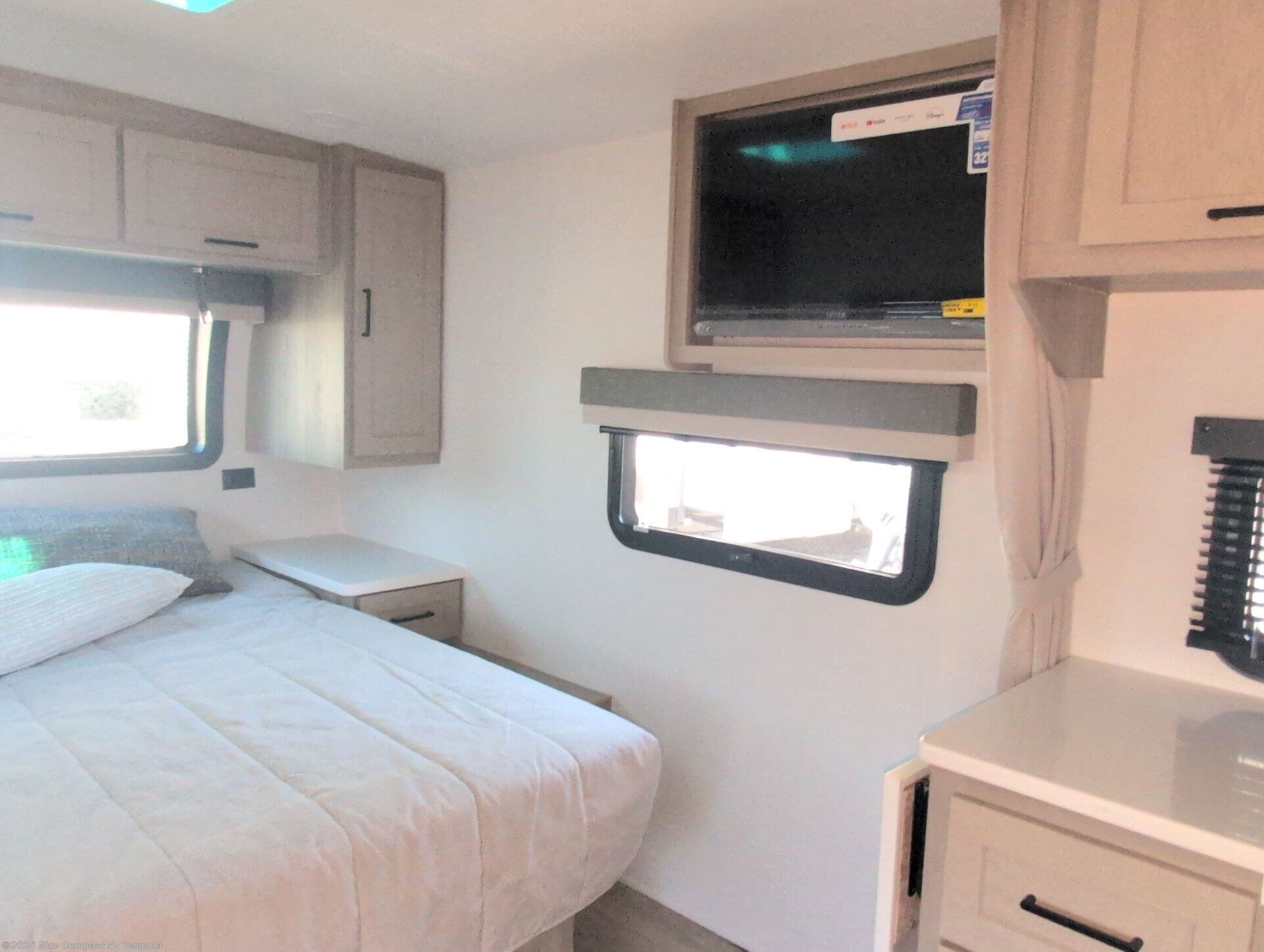 Wherever you decide to camp, you will love every minute in this cute couple's trailer. The sofa slide with a table will provide a place to relax, eat, and even sleep an extra guest if you have one, and the front RV queen bed includes a privacy curtain to enjoy your own space. There are dual bedroom wardrobes to keep your clothes tidy, and you'll find two pass-through storage compartments for your larger gear. Since there is a full bath on board you won't have to use the camp's facilities, and you can make it a movie night with the TV in the main living area!
