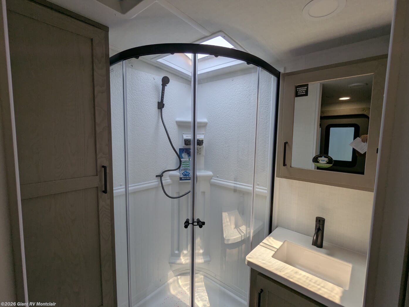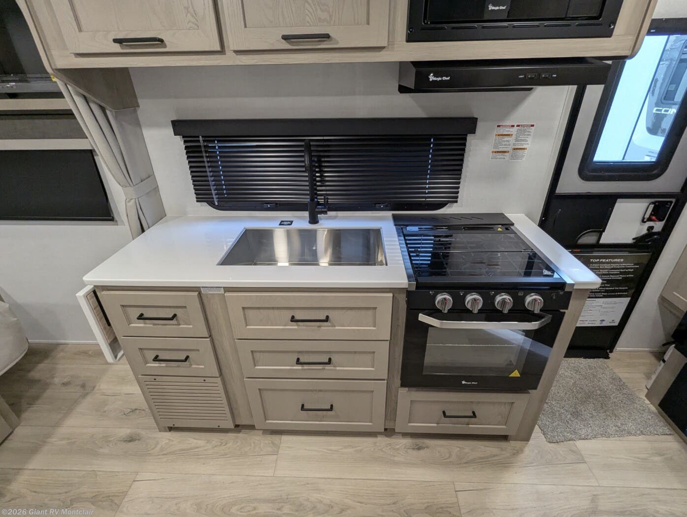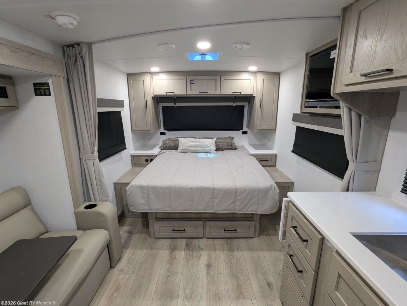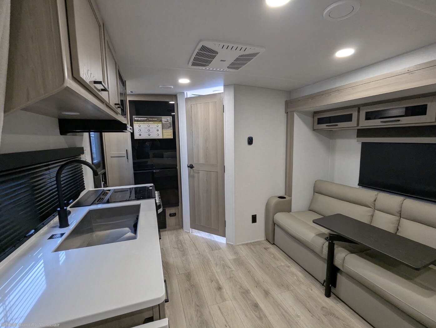 • Premium Features & Off-Grid Capability including a 200W solar panel with inverter, heated tanks, 15K BTU A/C, solid-surface countertops, and enclosed underbelly for extended-season camping.