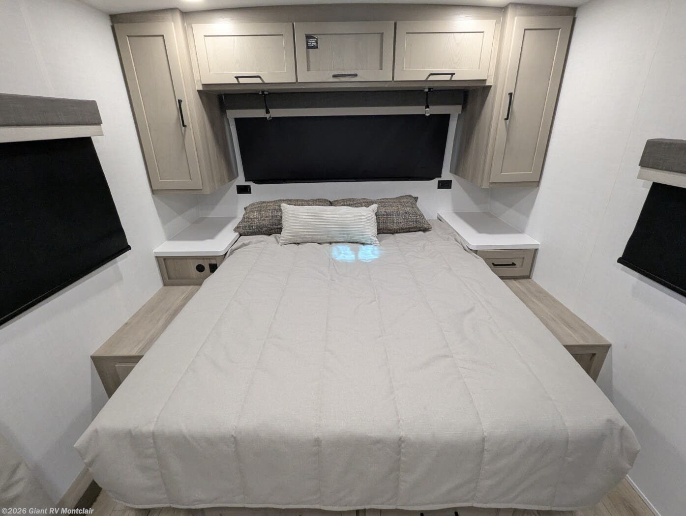 • Front Queen Bed with Privacy featuring dual wardrobes, overhead storage, and surrounding windows for a bright, comfortable sleeping area.