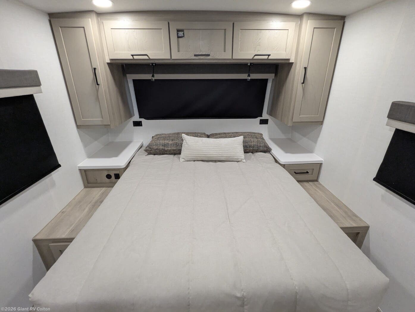 • Front Queen Bed with Privacy featuring dual wardrobes, overhead storage, and surrounding windows for a bright, comfortable sleeping area.